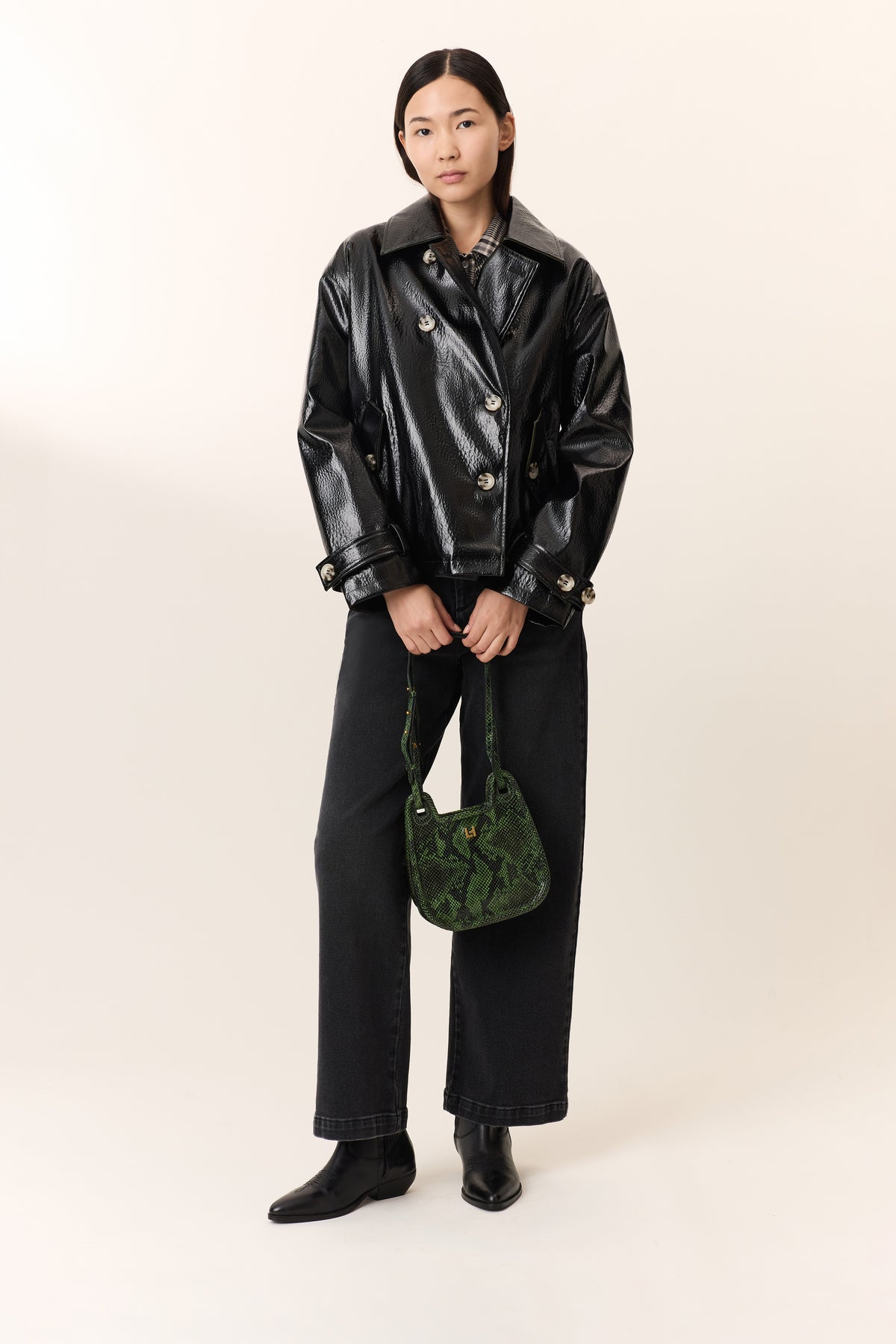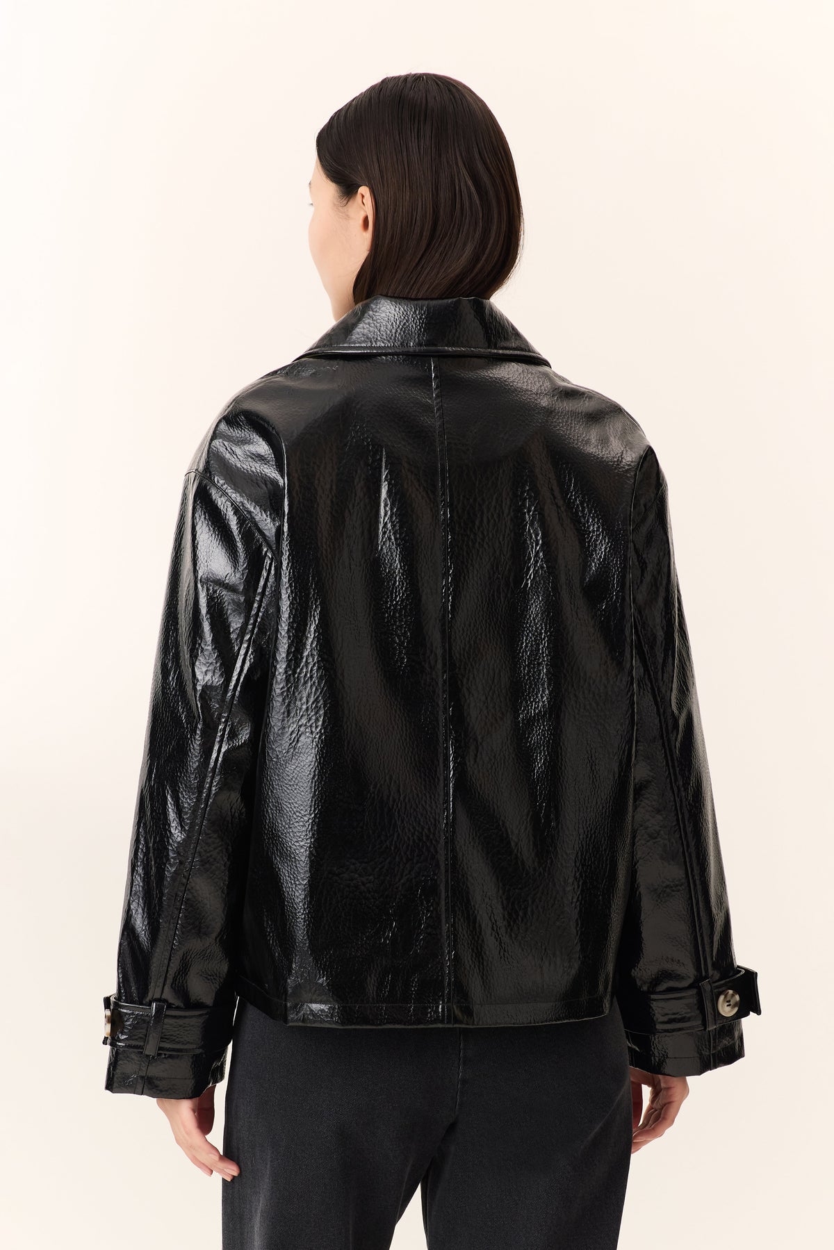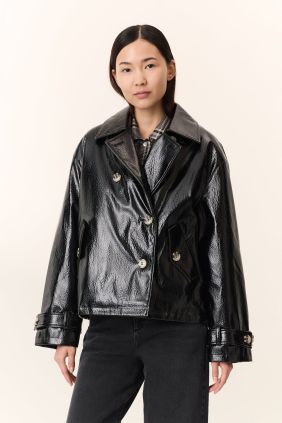 lLa chaqueta Vanni tiene un corte corto y estructurado. Su aspecto de charol y texturizado aporta relieve a tus looks, mientras que el amplio cuello con solapa afirma el espíritu contemporáneo de la prenda. El cierre cruzado, los precisos bolsillos con solapa y las lengüetas ajustables en los puños demuestran unos acabados exigentes.