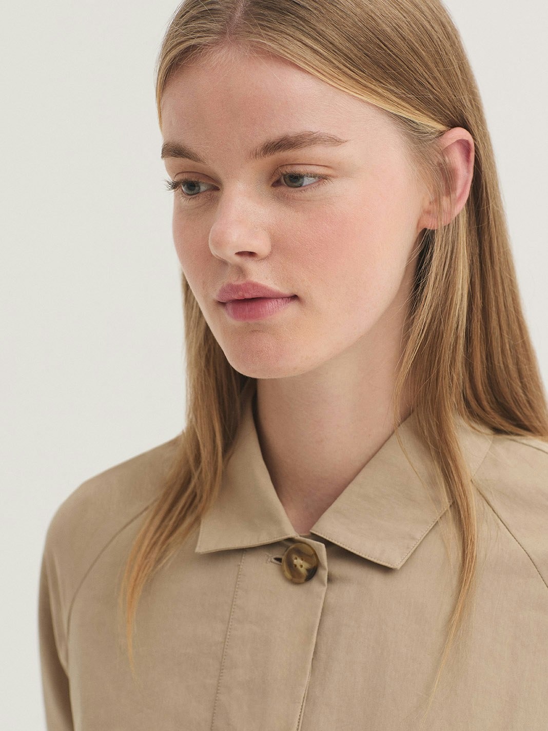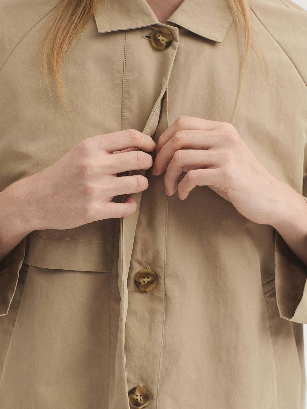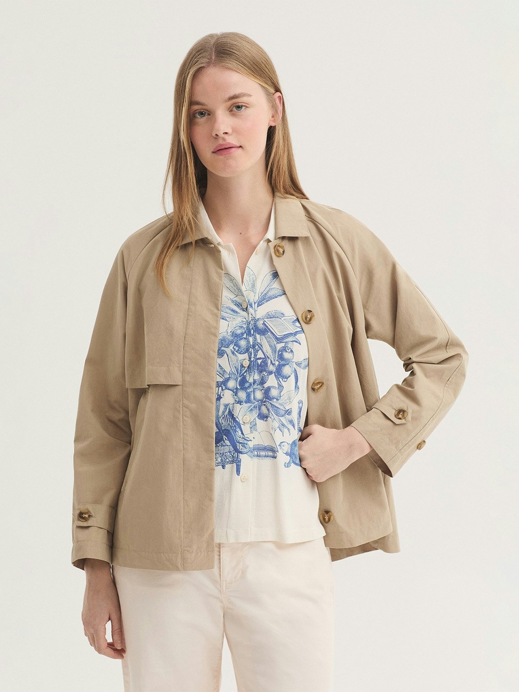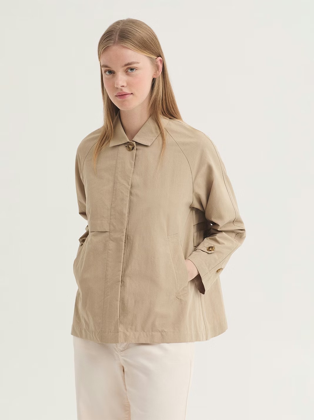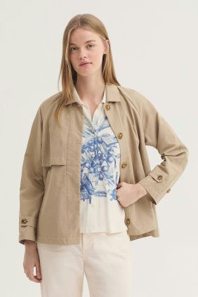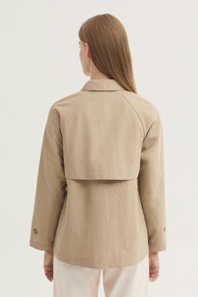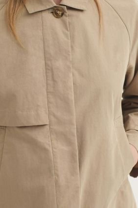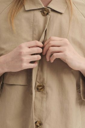 Trench confeccionado en mezcla de algodón y Nailon repelente al agua.Presenta un cuello camisero y abotonadura oculta.