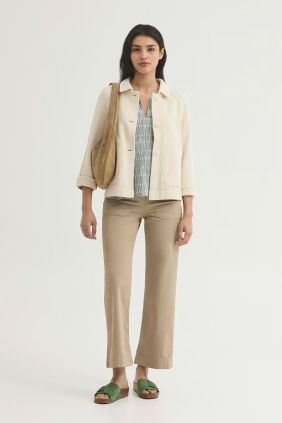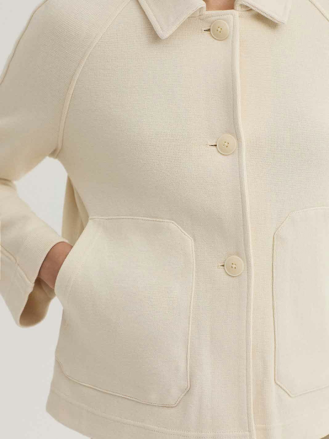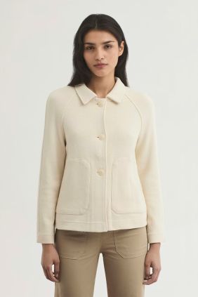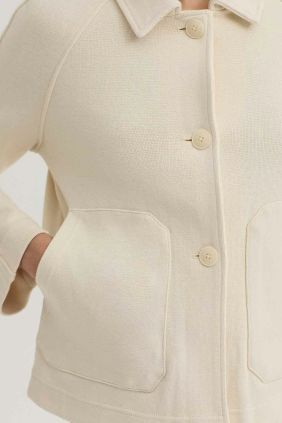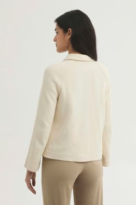 Cazadora abotonada.Cuello camisero,bolsillos delanteros y abertura central trasera.Manga larga caída.