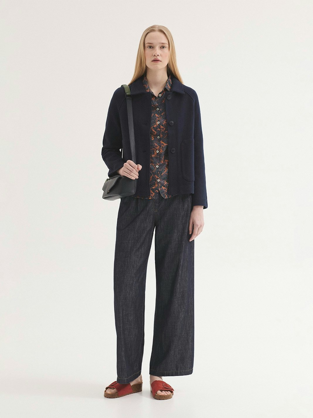 Cazadora abotonada.Cuello camisero,bolsillos delanteros y abertura central trasera.Manga larga caída.