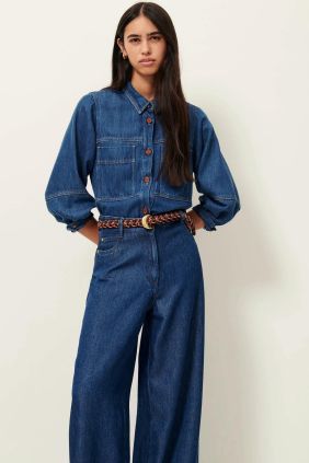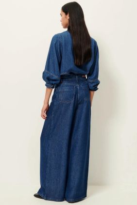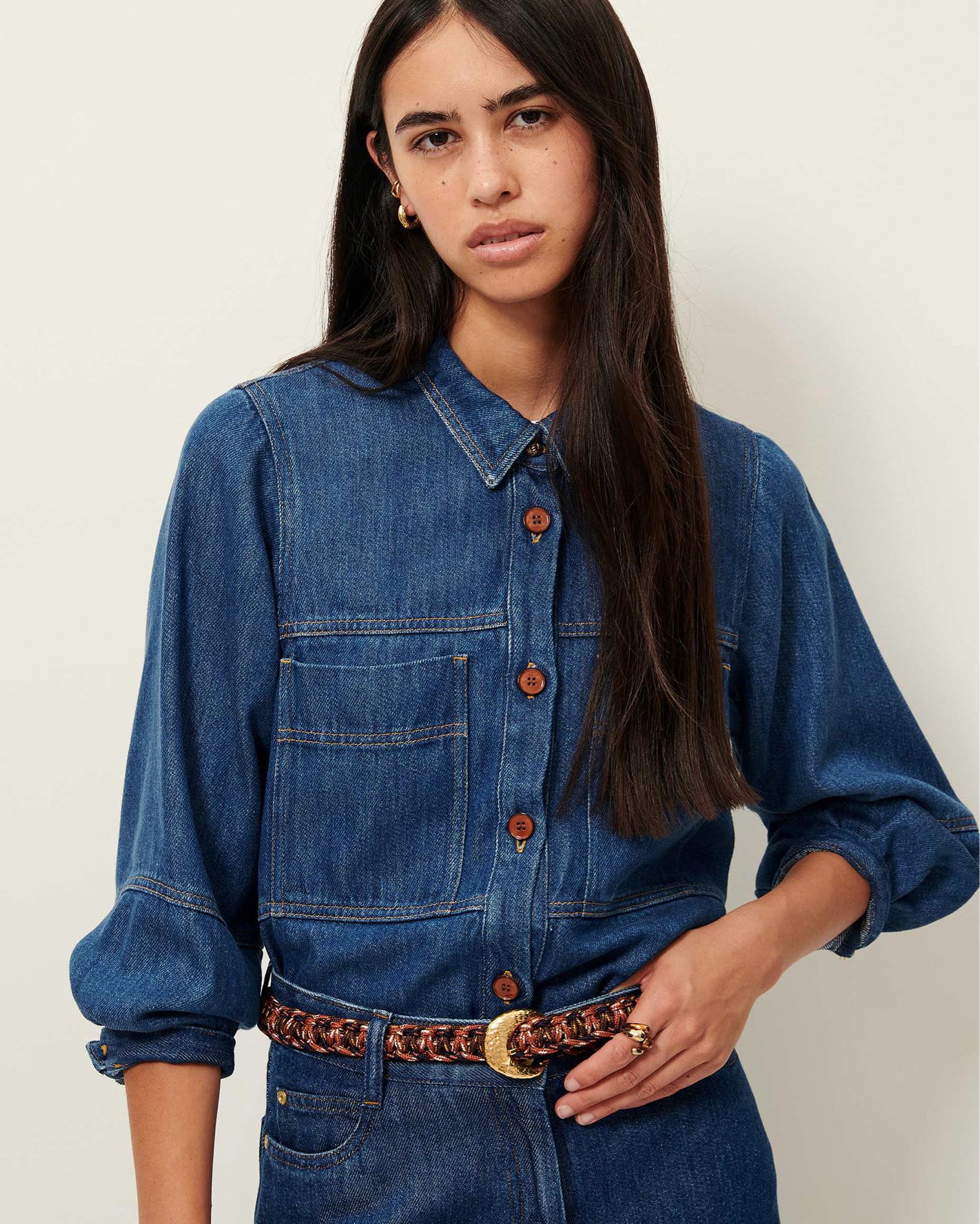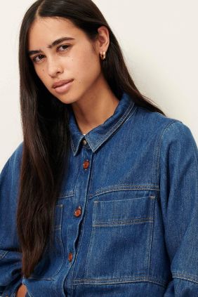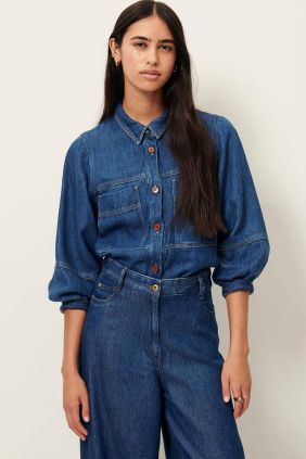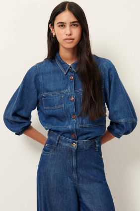 Sobrecamisa en tejido denim fluido lavado a la piedra con manga globo.