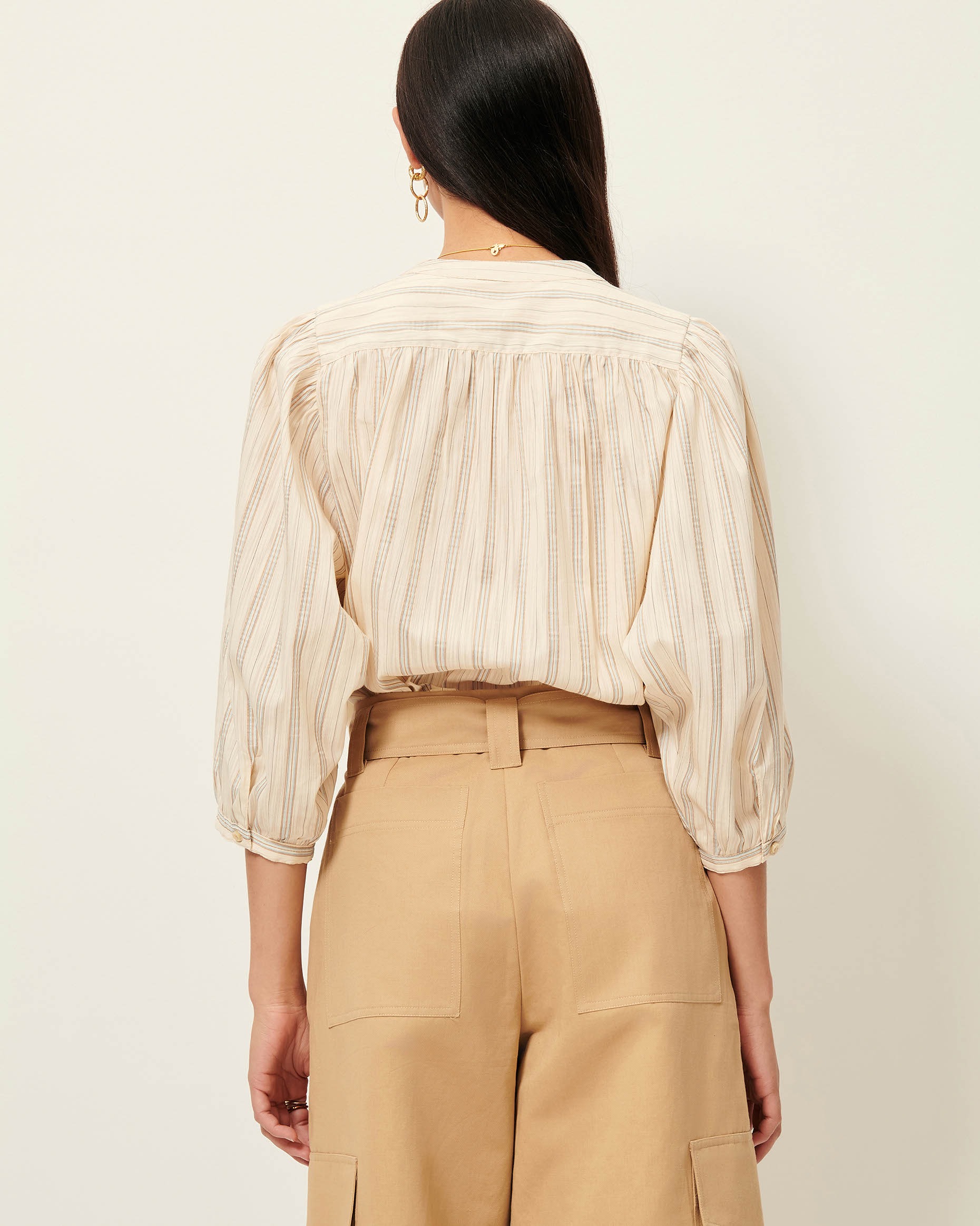 Detalles de frunces en hombros y puños.