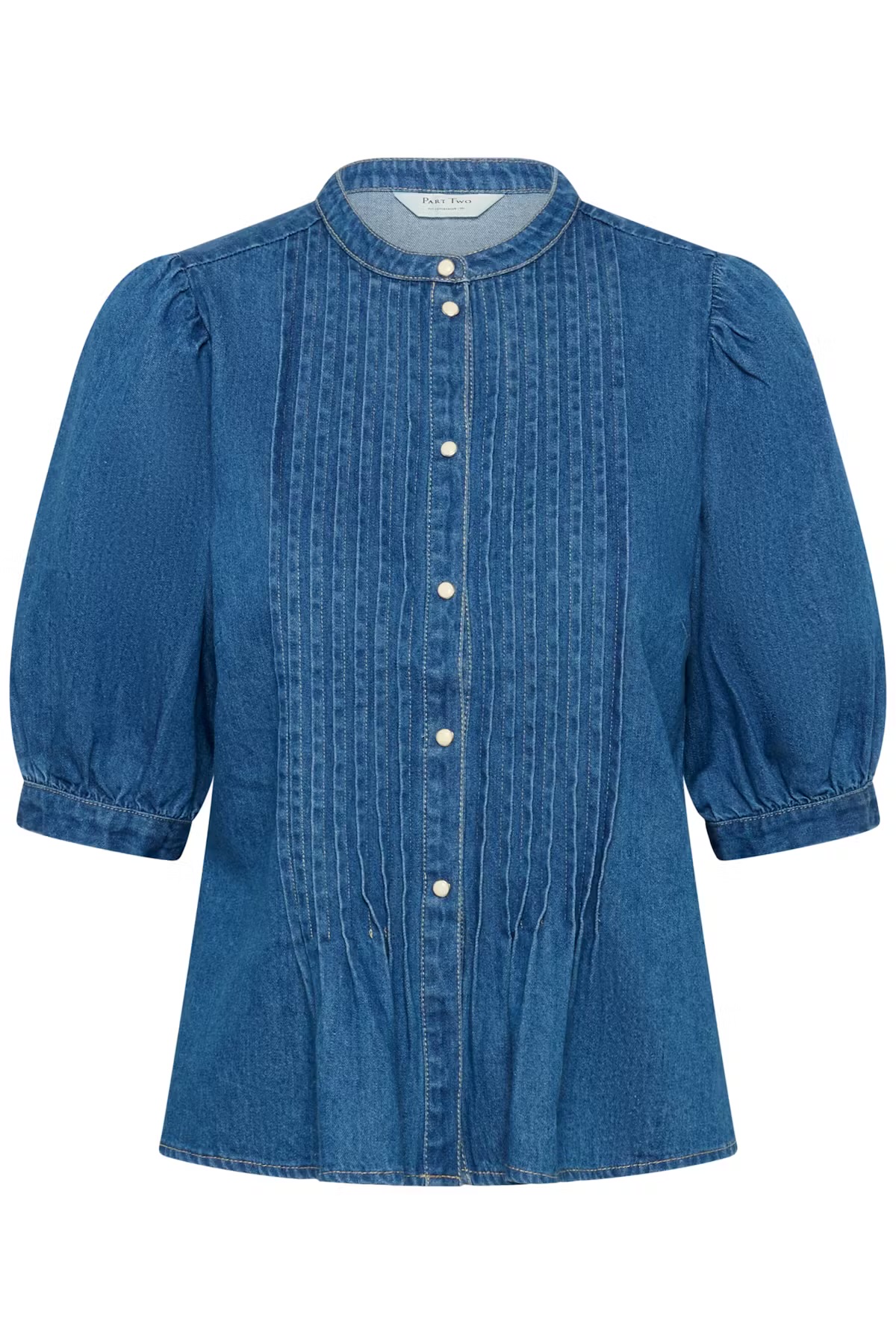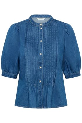 Esta blusa vaquera presenta un corte recto,pliegues delanteros y mangas voluminosas hasta los codos.