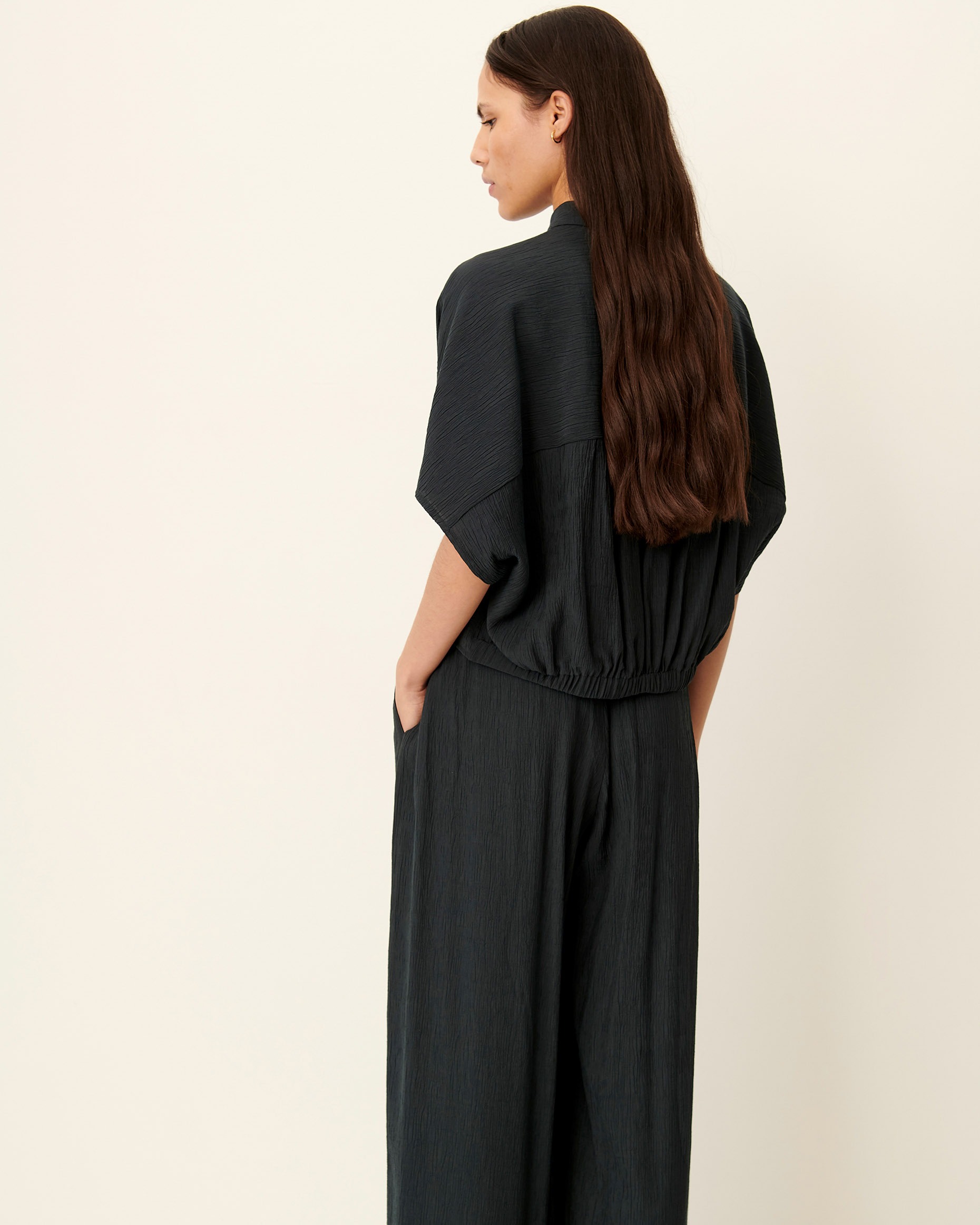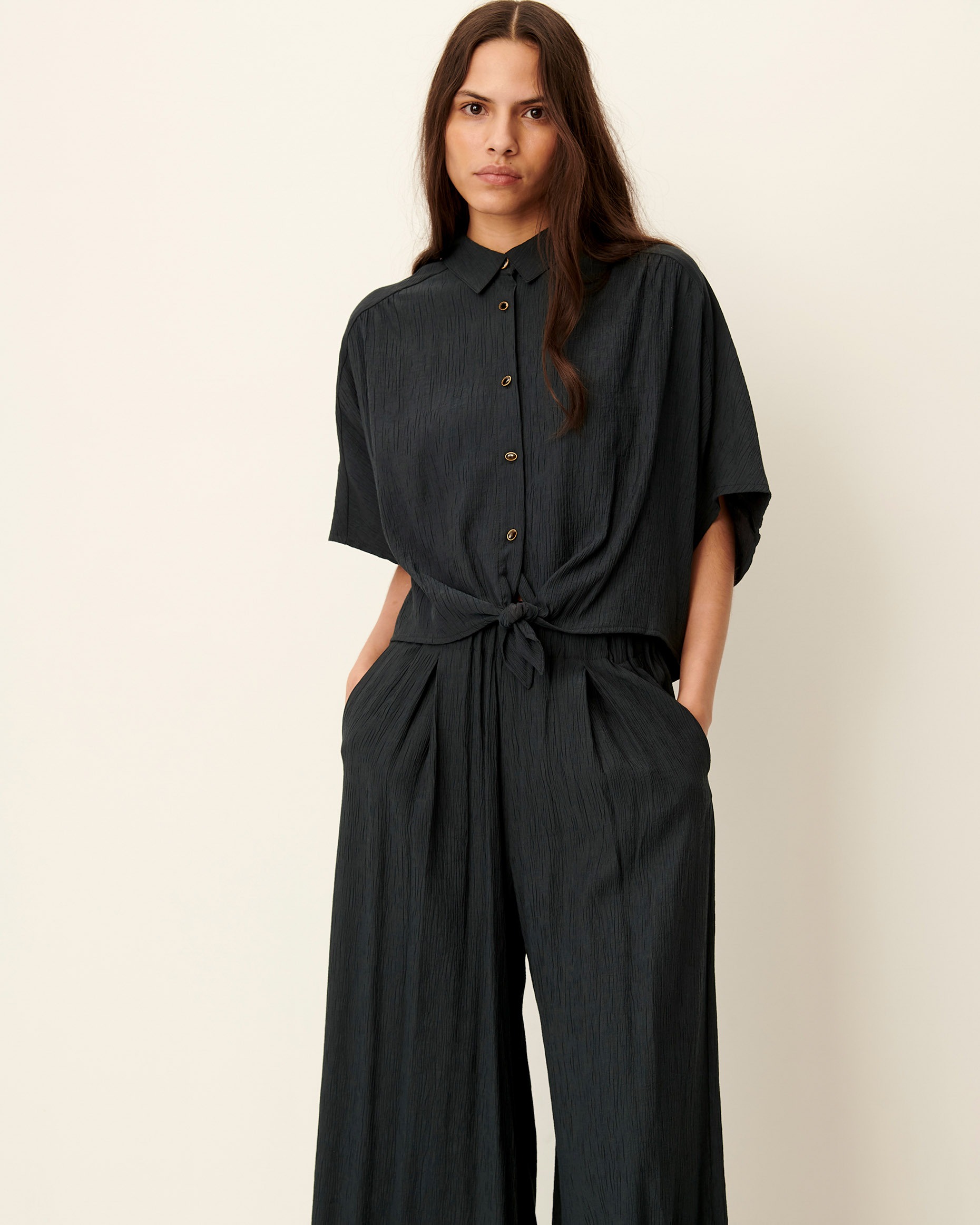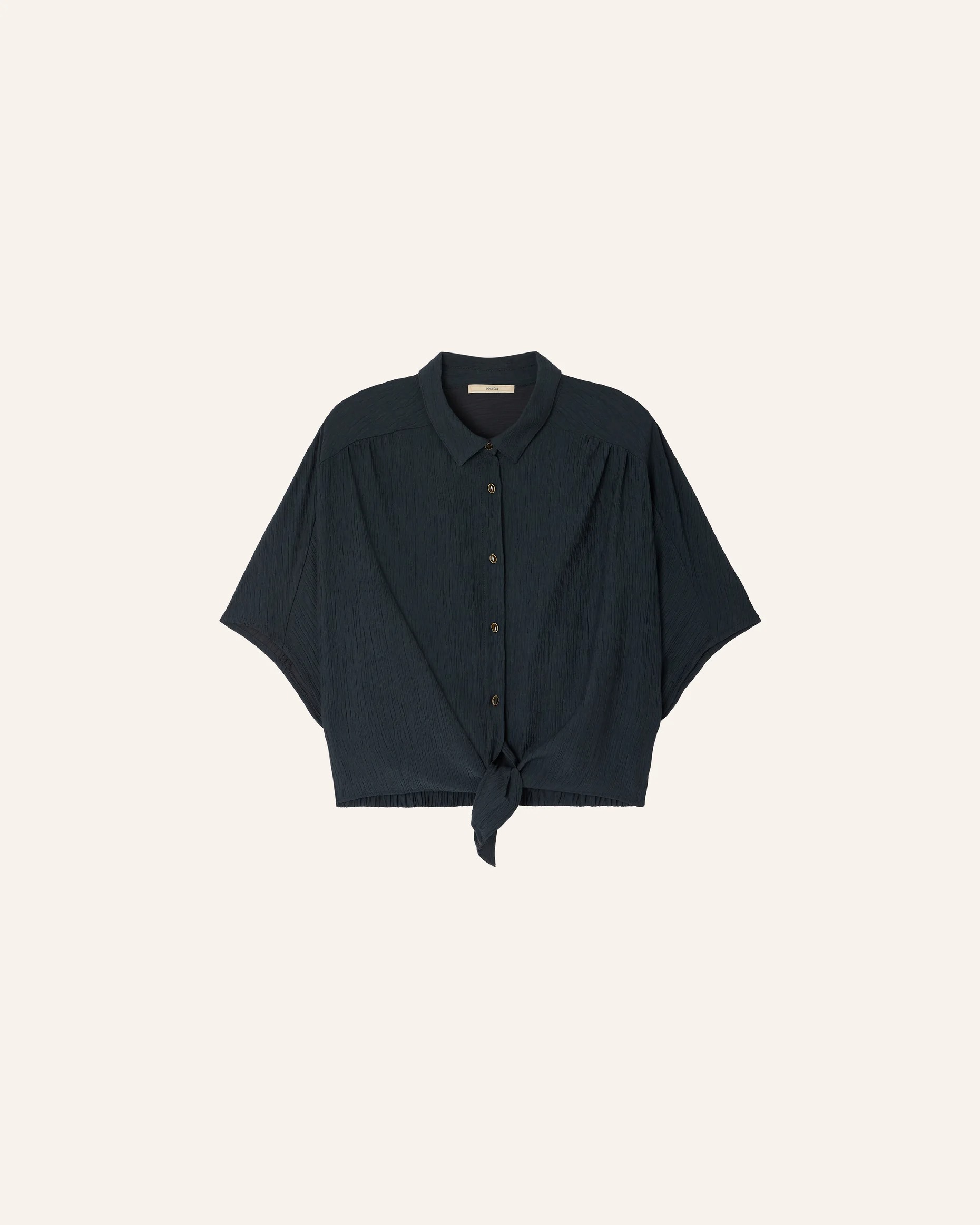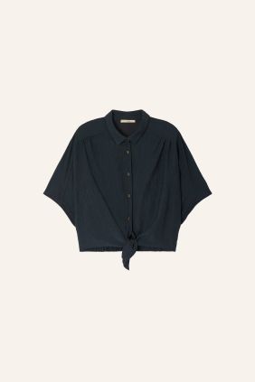Camisa corta anudada elástica en crespón milrayas de viscosa flexible.