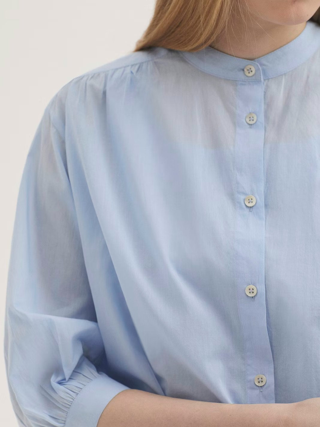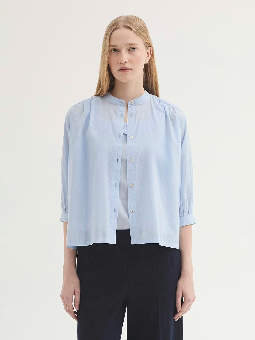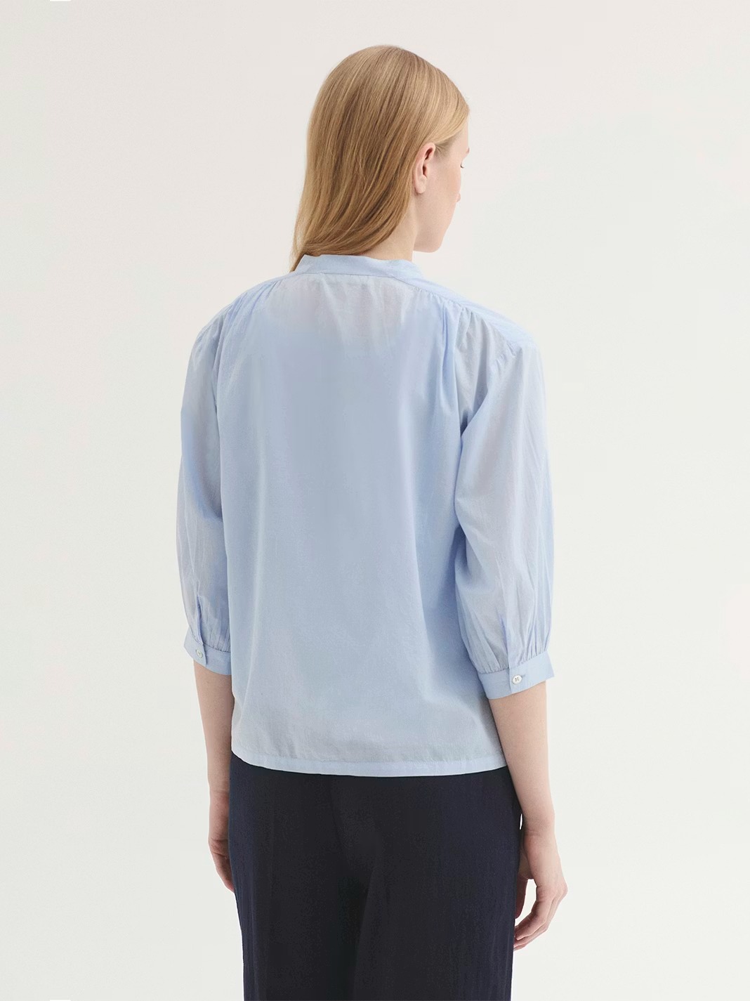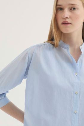 Camisa femenina de estilo delicado y natural confeccionada en voile de algodón, un tejido ligero, suave y transpirable que aporta frescura y comodidad. Su diseño minimalista refleja la esencia de Nice Things Paloma S, combinando elegancia sencilla con funcionalidad para el día a día.