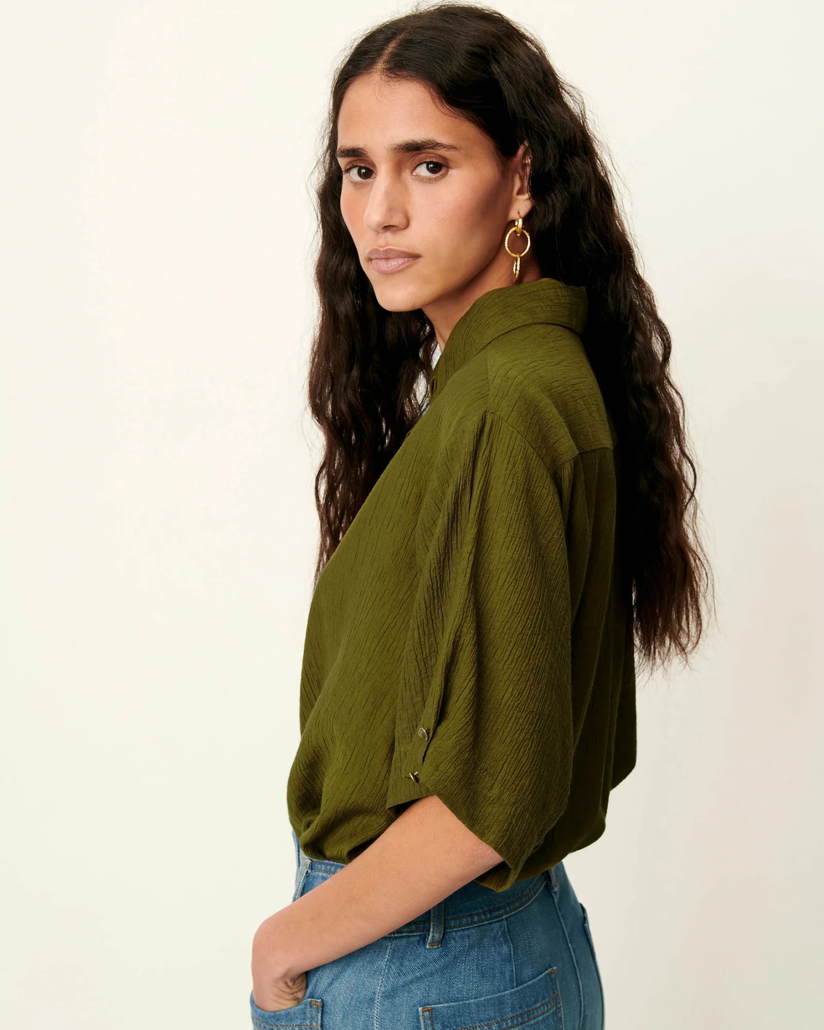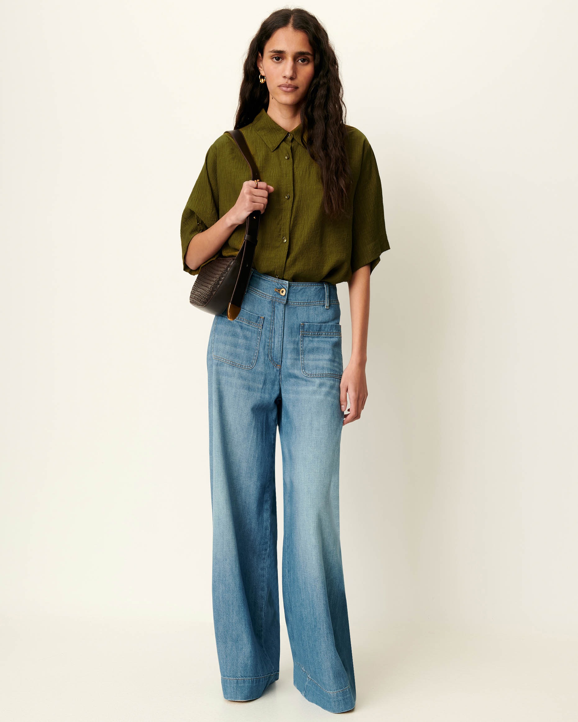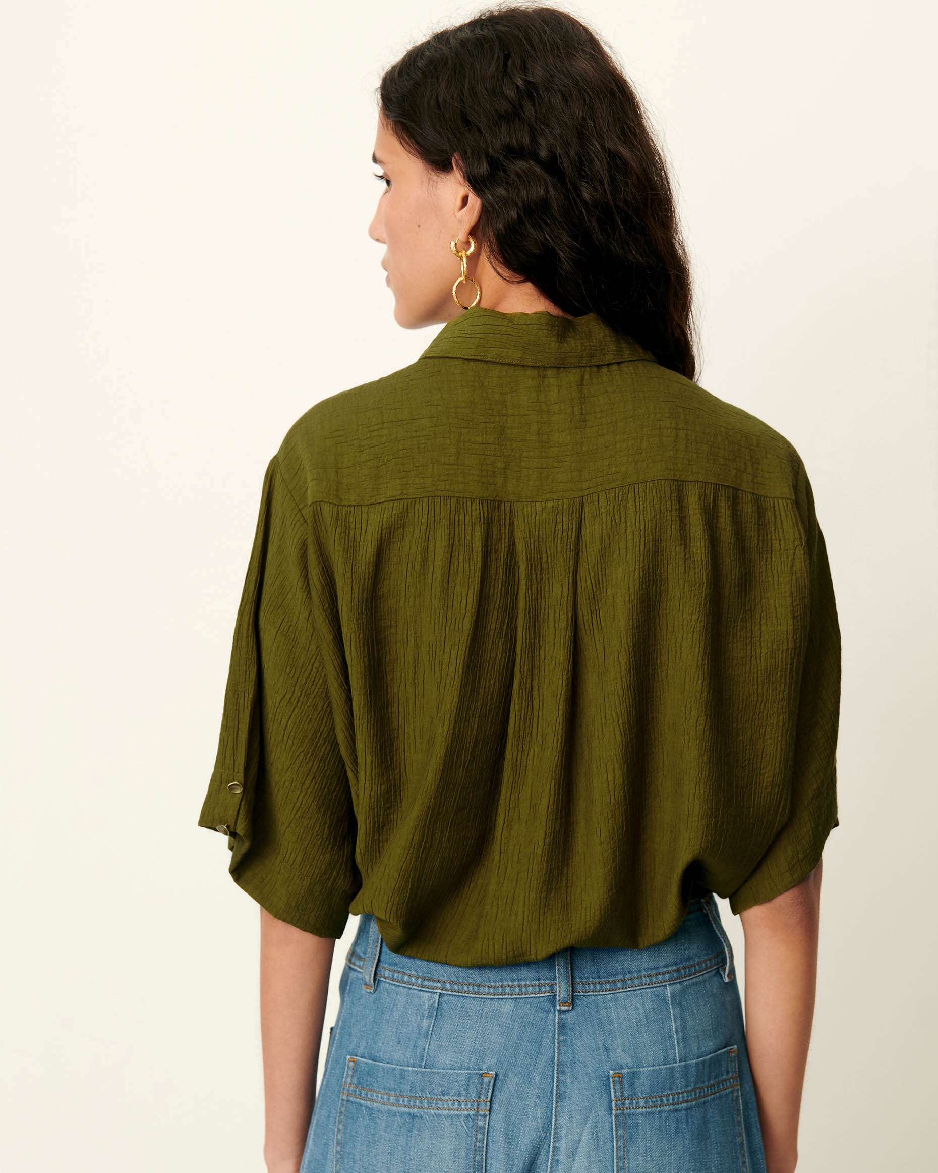 Confeccionada en tejido ligero de alta calidad, destaca por su suavidad, caída natural y transpirabilidad, siendo una prenda perfecta para entretiempo o para elevar estilismos diarios con un toque refinado.