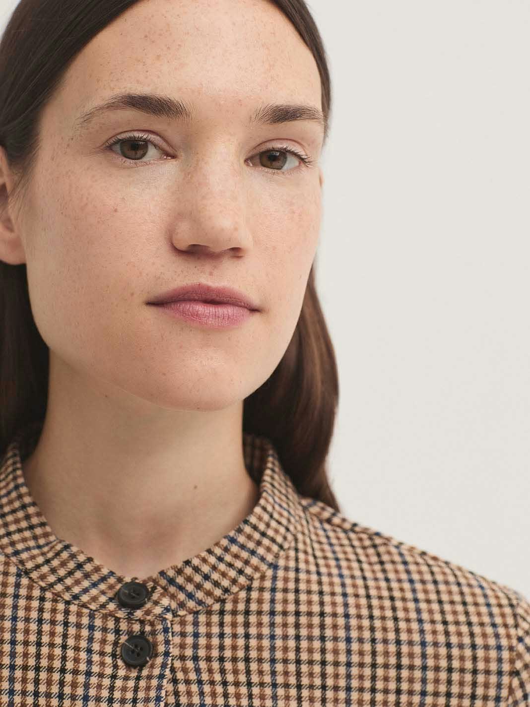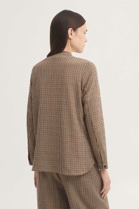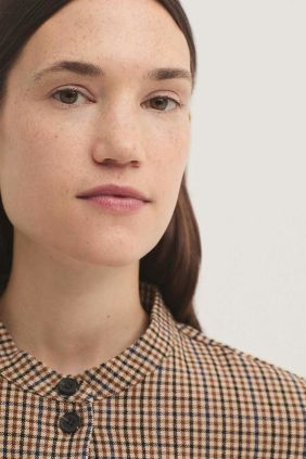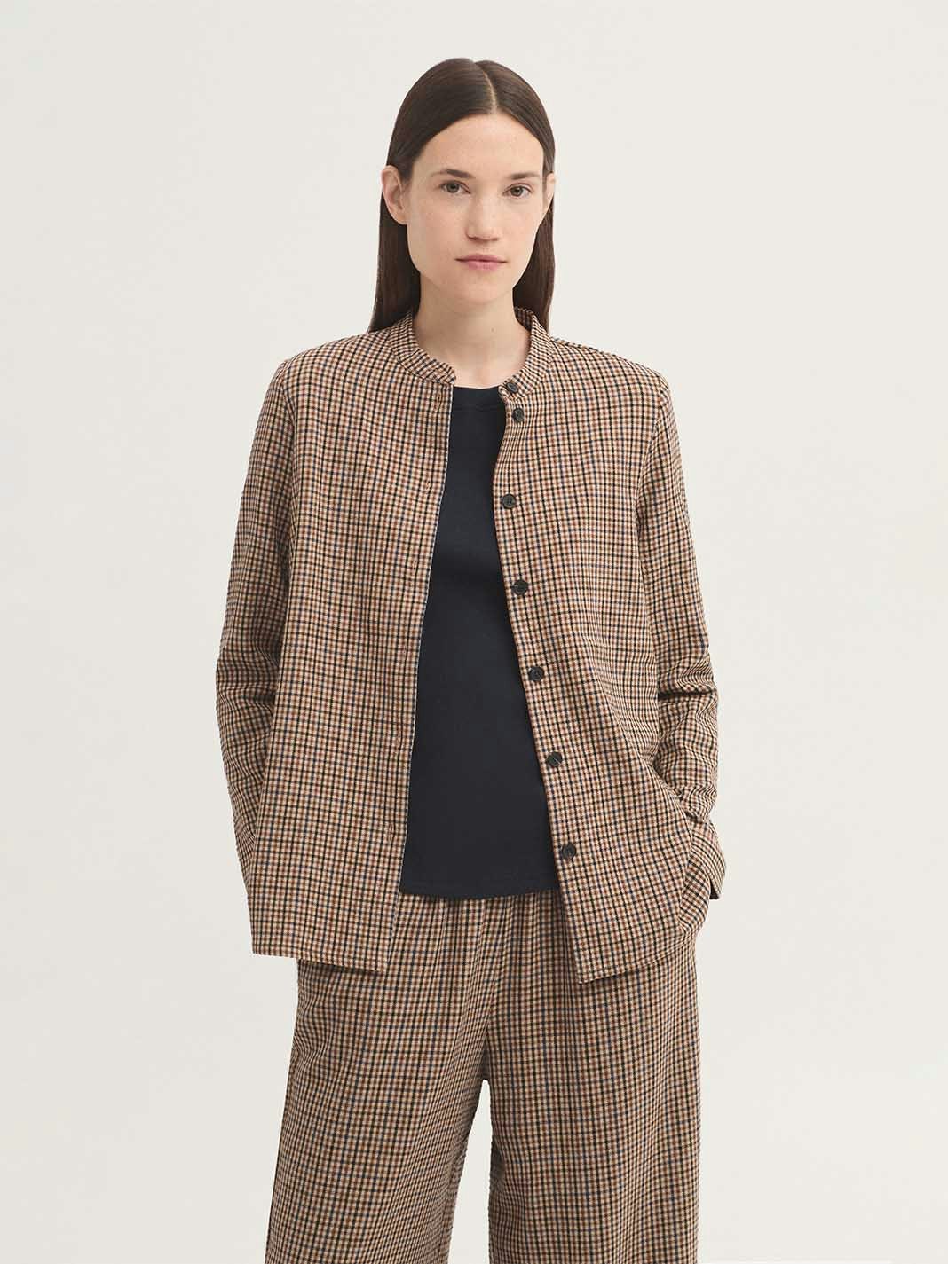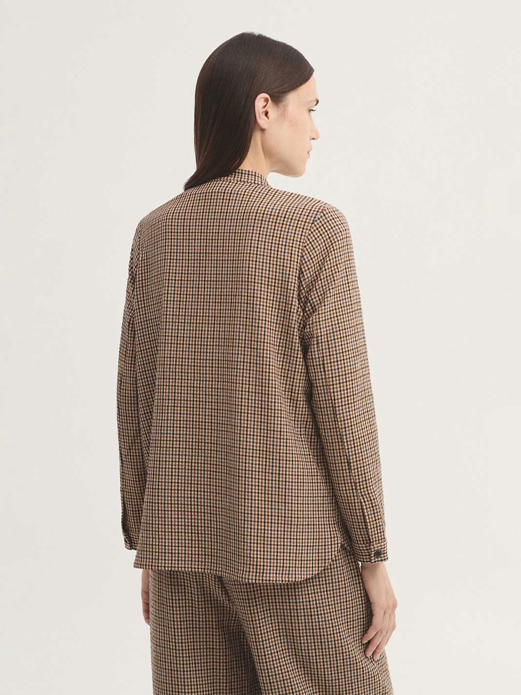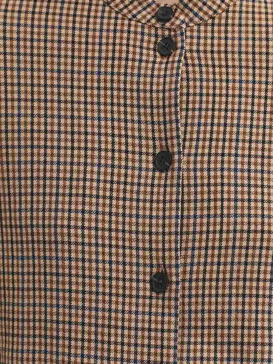 Sobrecamisa en tejido de cuadros efecto arrugado. Cuello mao y botonadura frontal. Manga larga con abertura, puño y botón