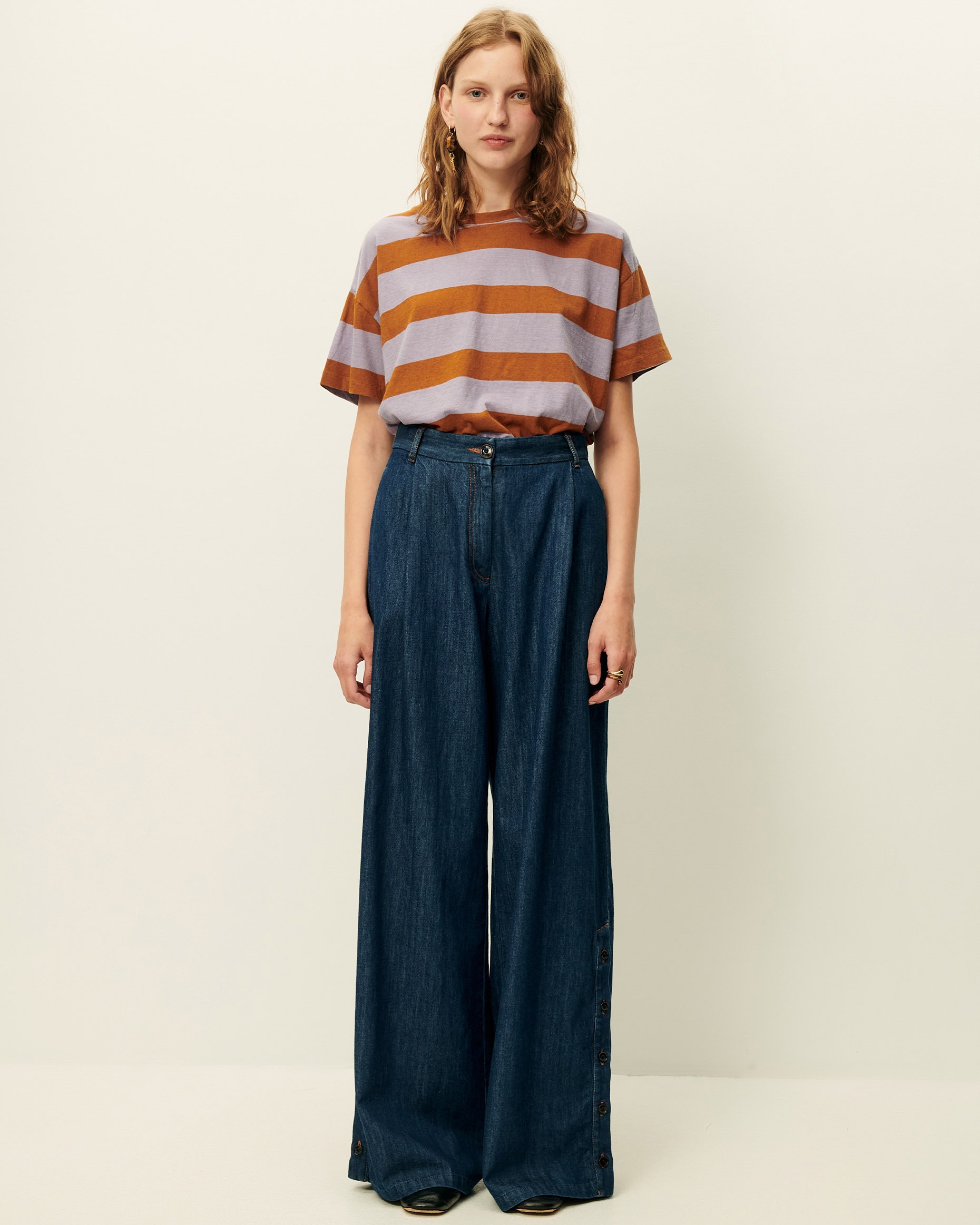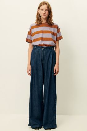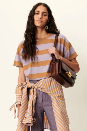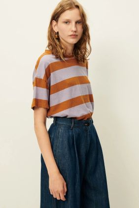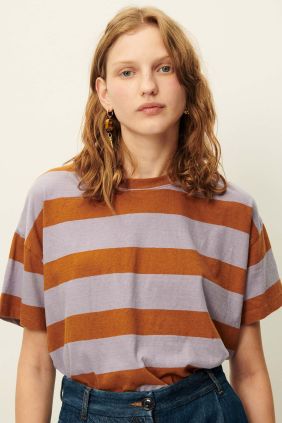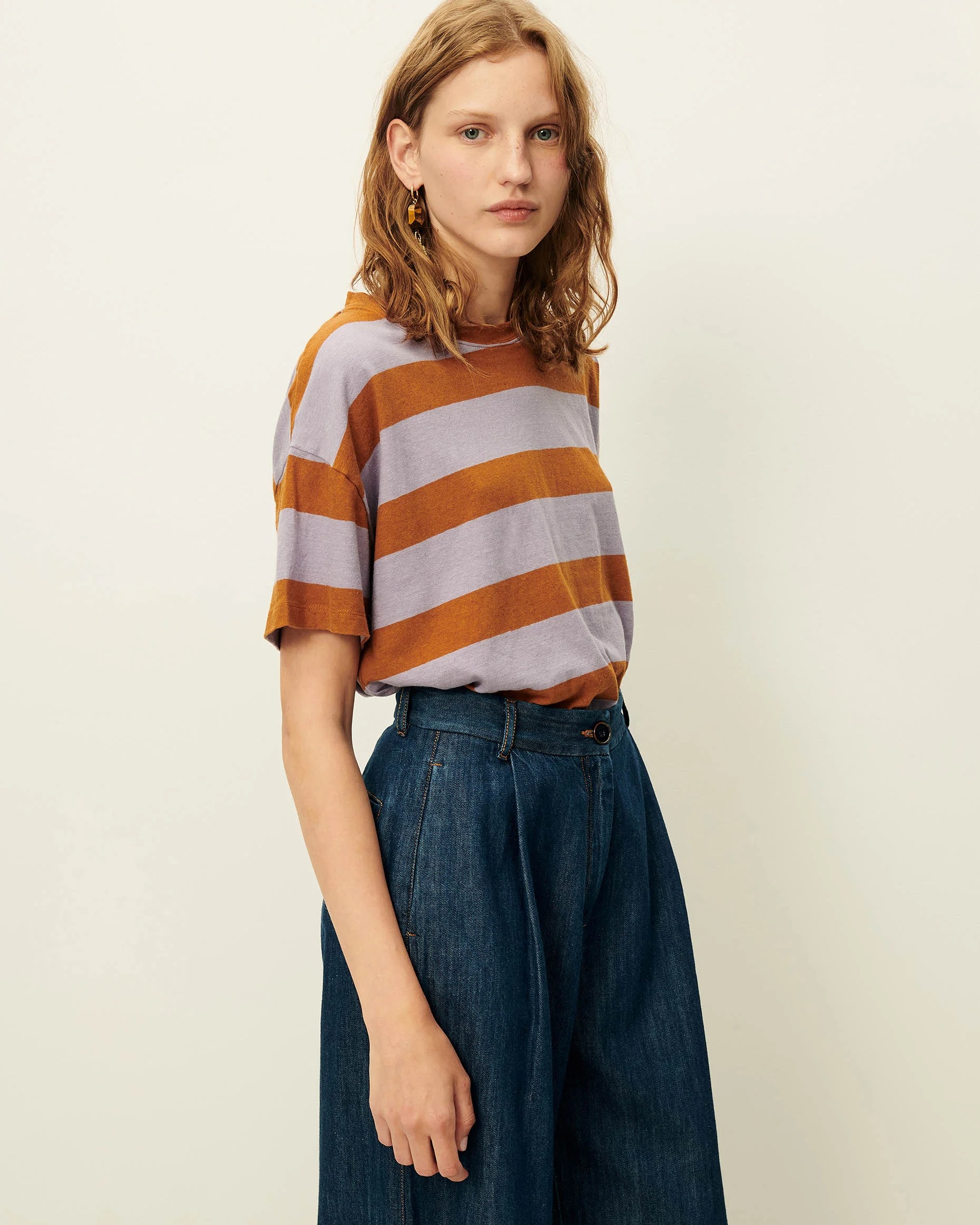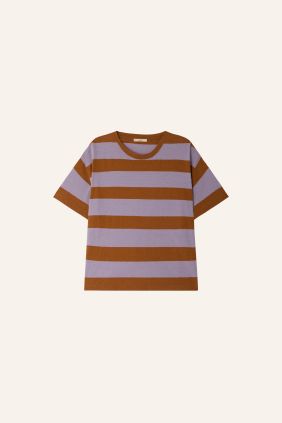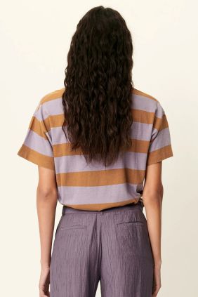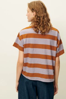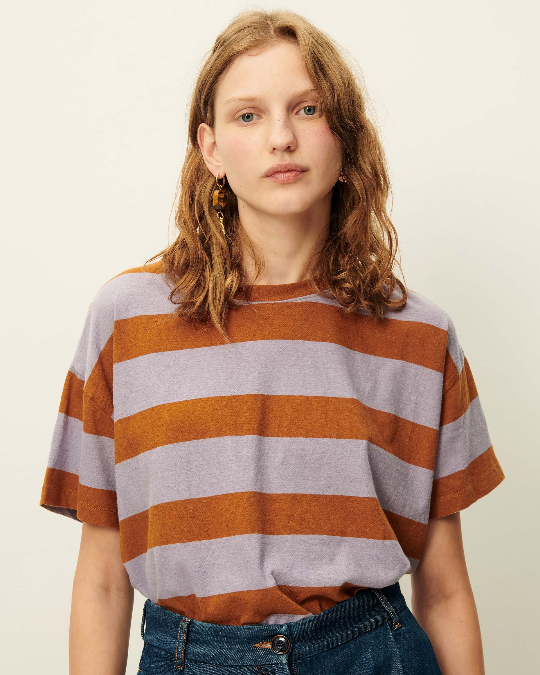 Camiseta femenina de estilo relajado con diseño a rayas, confeccionada en una mezcla de algodón y lino que aporta frescura y comodidad. Su estética natural y contemporánea la convierte en una prenda ideal para el día a día.