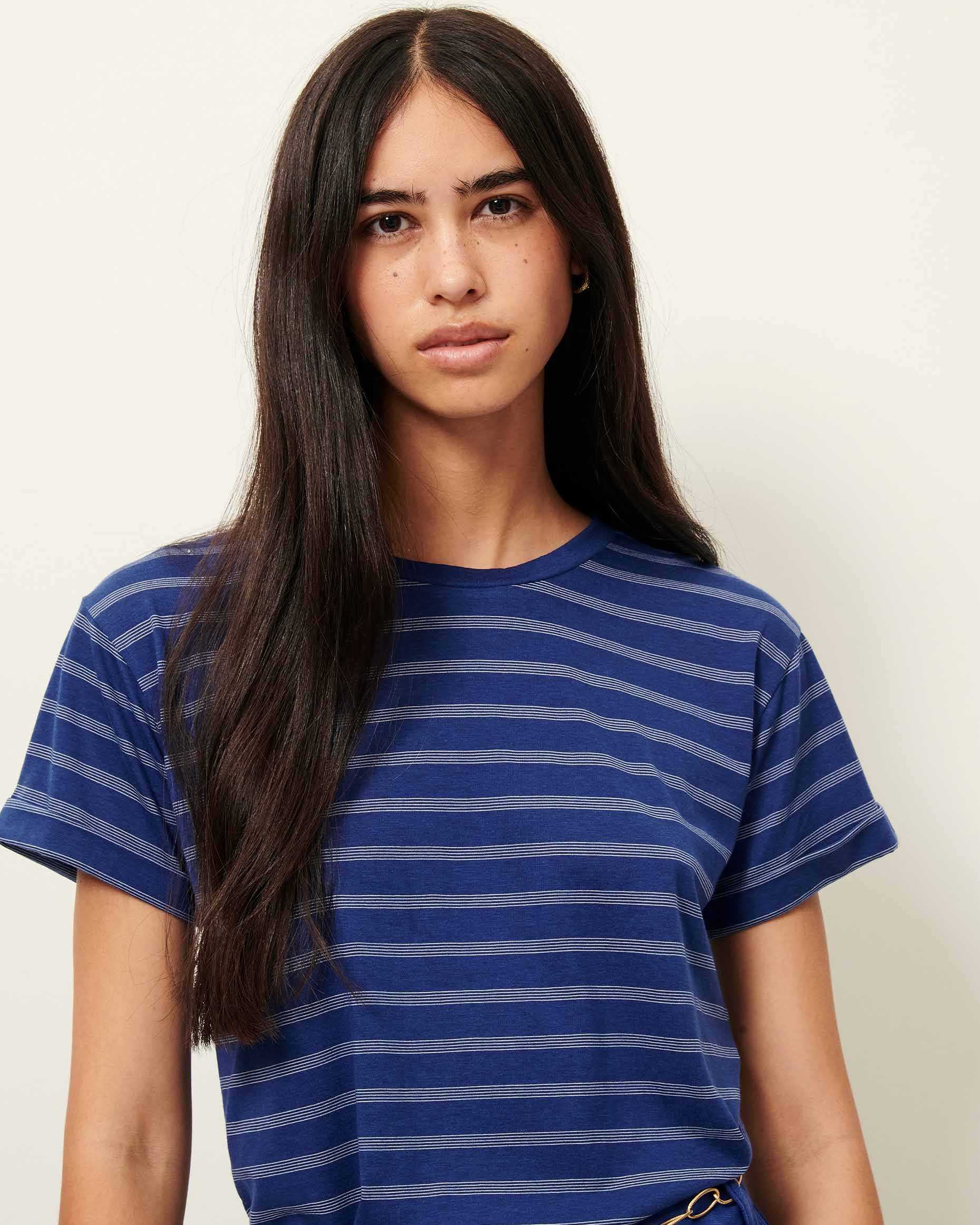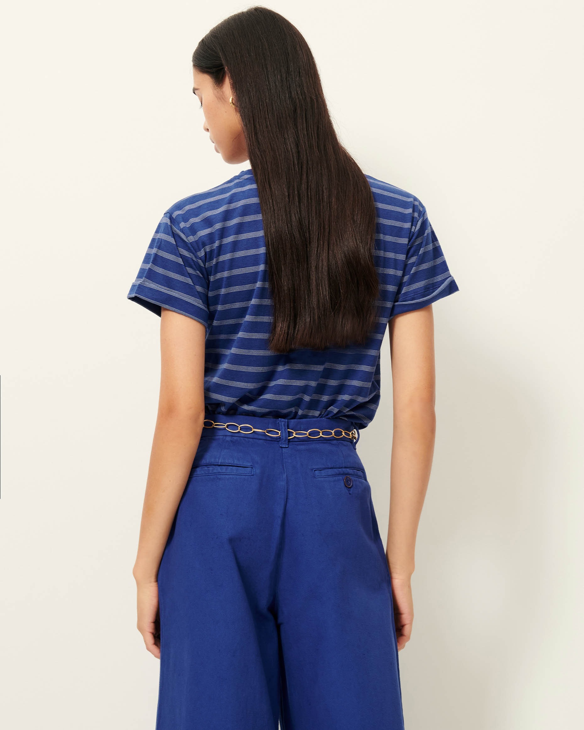 Camiseta femenina de estilo contemporáneo con el sello distintivo de Sessùn. Su diseño en color Blazer Blue con rayas en contraste aporta un aire fresco y sofisticado, ideal para elevar looks del día a día.