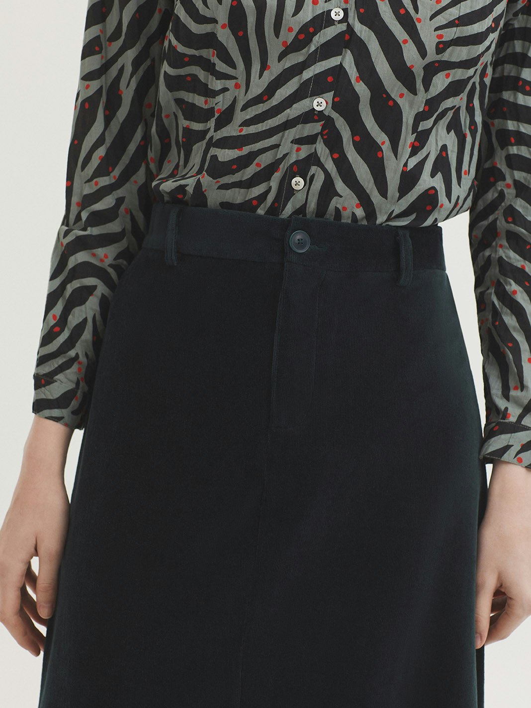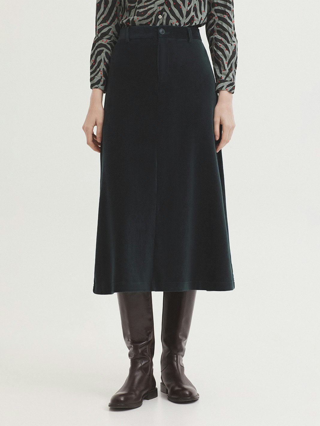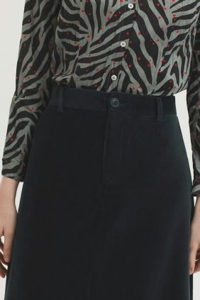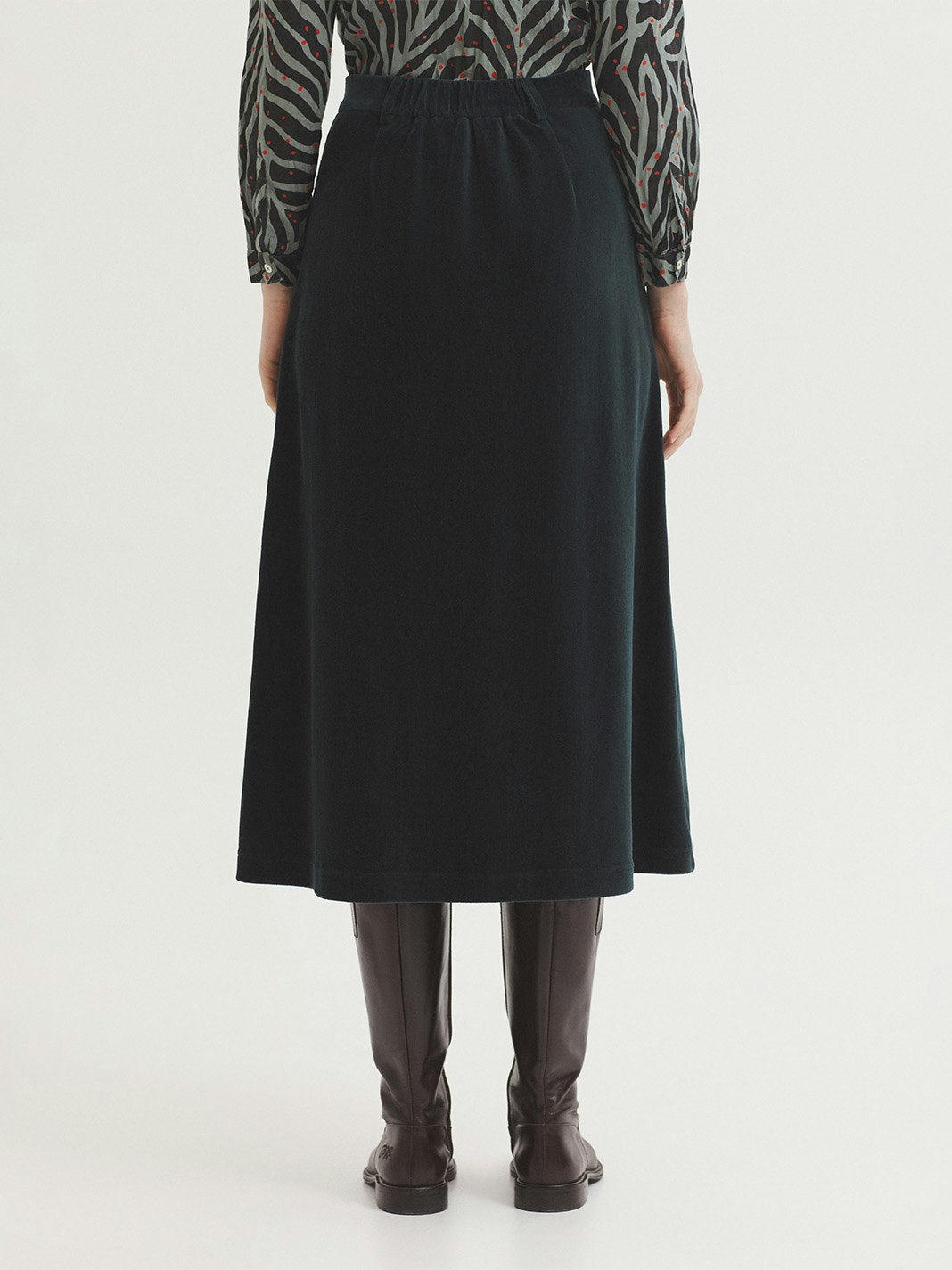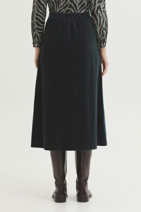 Falda larga en micropana elástica de algodón. Cierre con cremallera y botón en el centro delantero. Goma en la parte de la espalda.