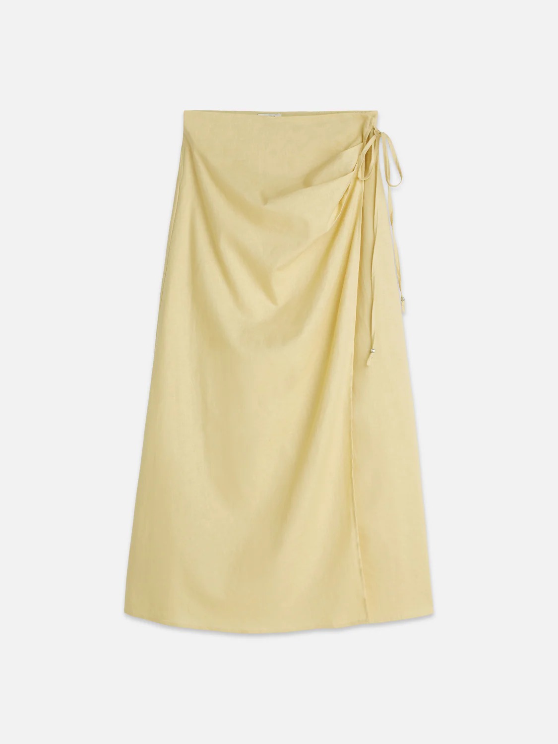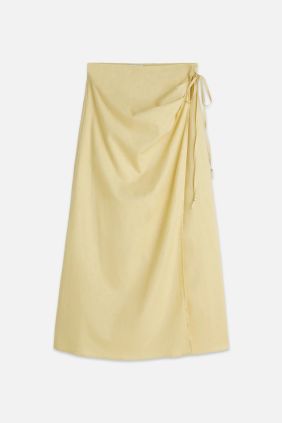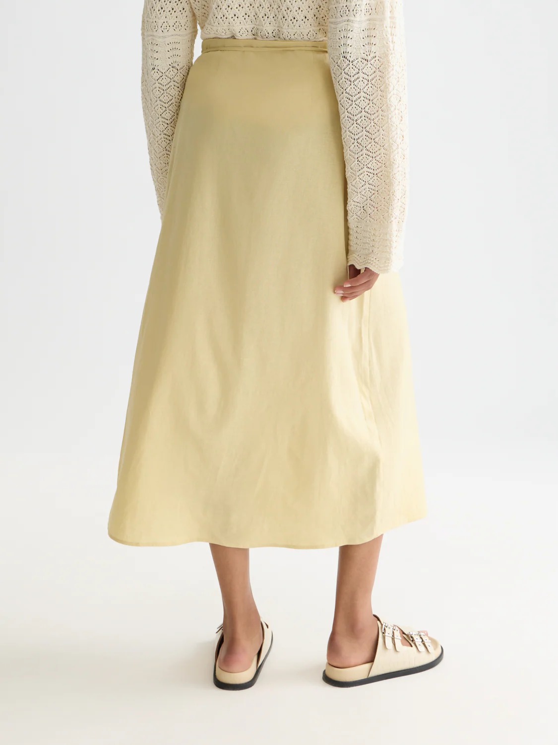 Falda midi de corte envolvente con diseño wrap (cinturón lateral) de Scotch & Soda, confeccionada en una mezcla ligera de lino con viscosa y un toque de elastano, que proporciona una caída fluida y cómoda, perfecta para looks frescos de primavera y verano.