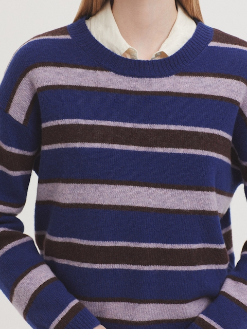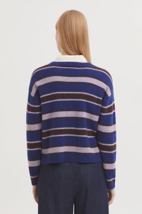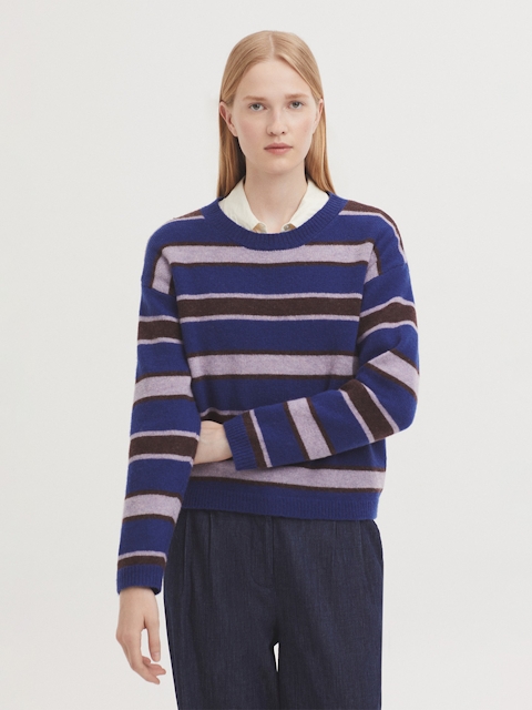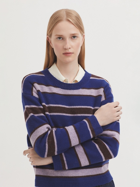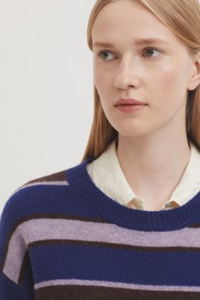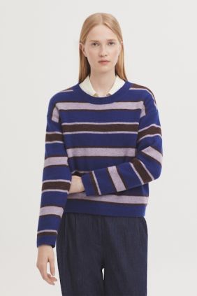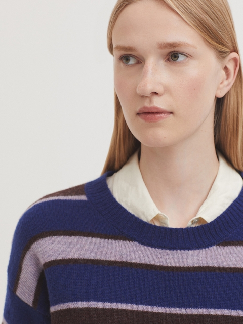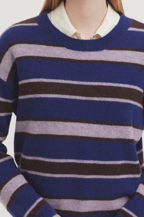 Jersey básico de rayas tricolor en lana. Cuello redondo, manga larga y acabados en rib.