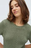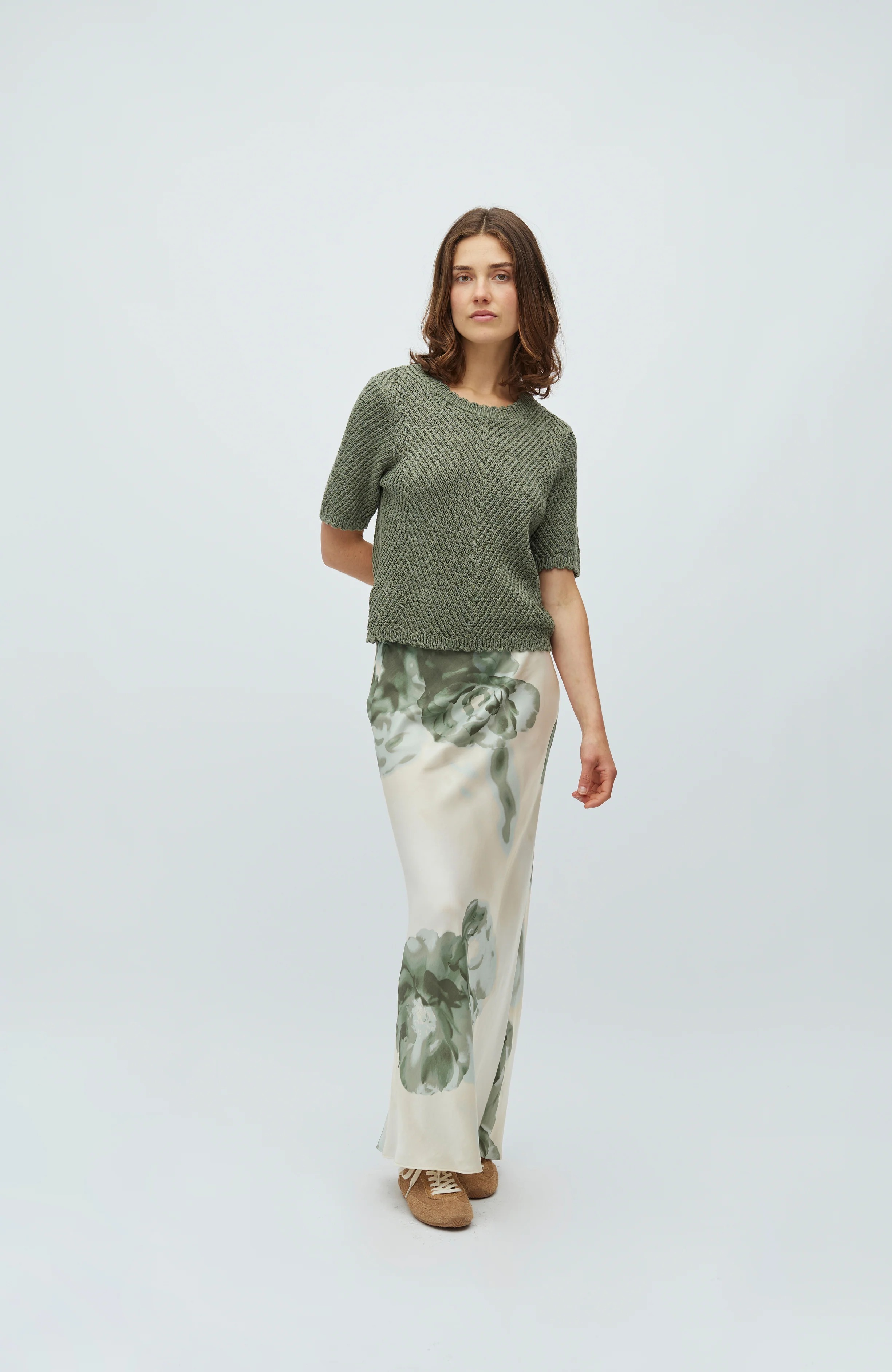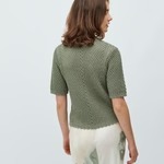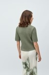 Este modelo presenta un corte relajado con manga corta y cuello redondo, ofreciendo una silueta cómoda y favorecedora. Sus acabados en canalé en cuello, mangas y bajo aportan estructura sin perder su estética ligera y desenfadada.