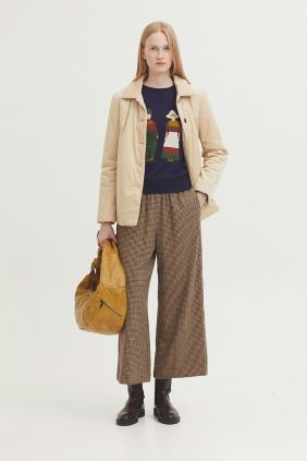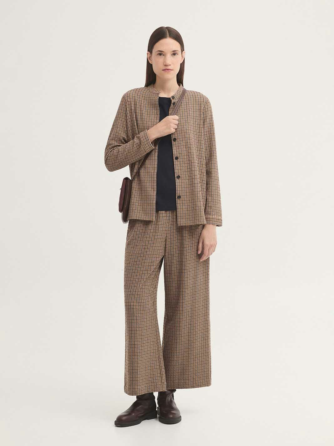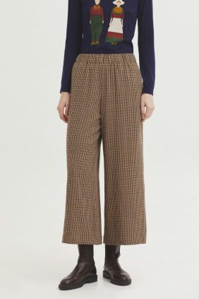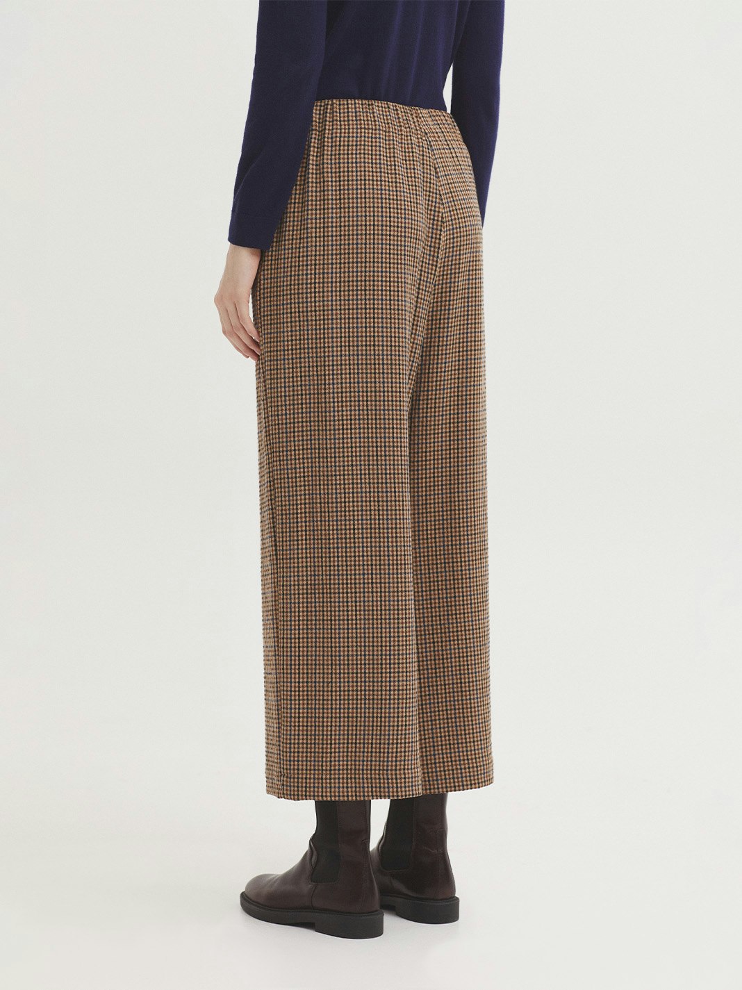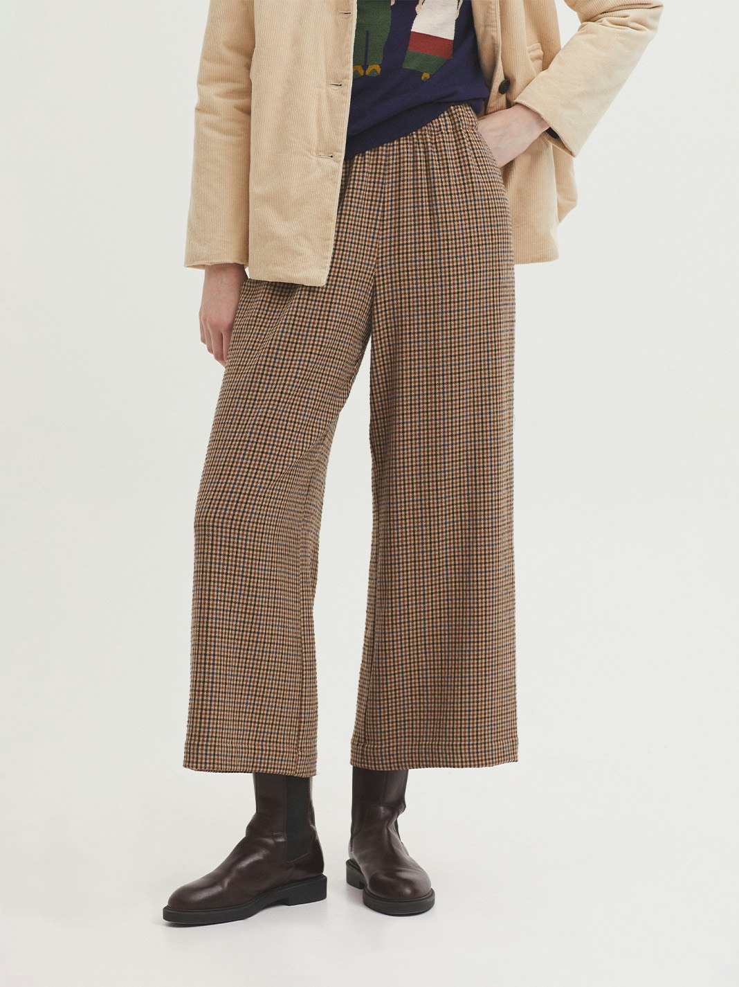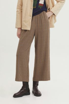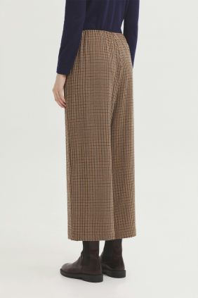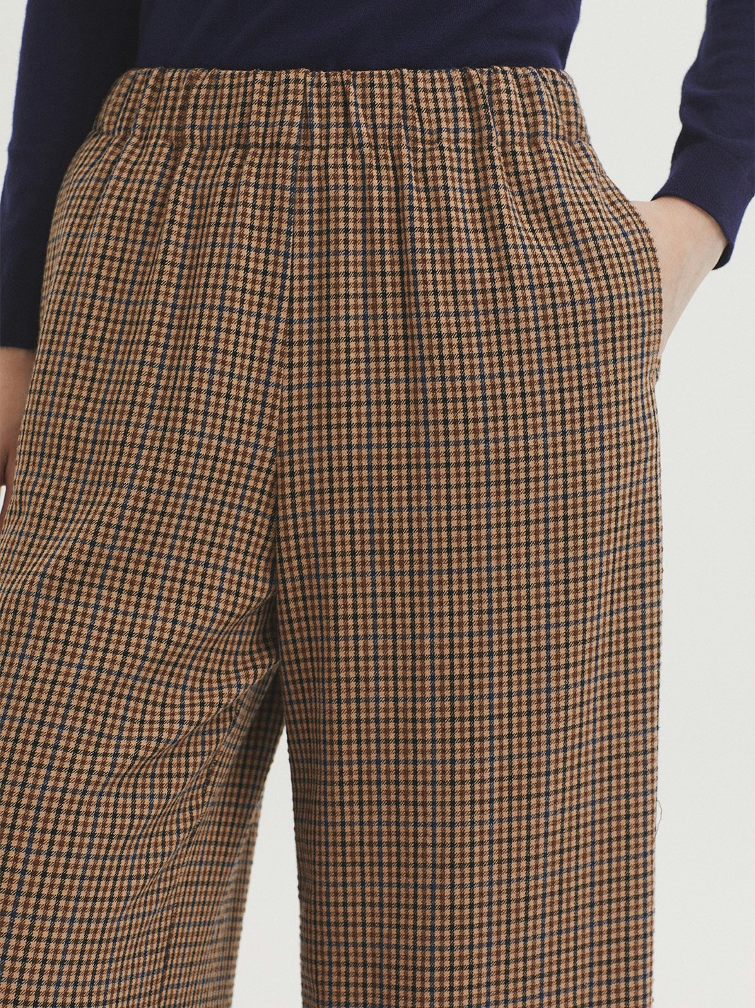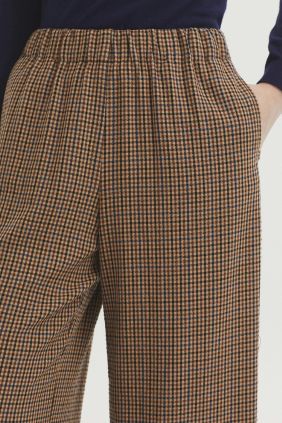 Pantalón en tejido de cuadros efecto arrugado. Cinturilla con goma interior. Bolsillos laterales. Pierna ancha.