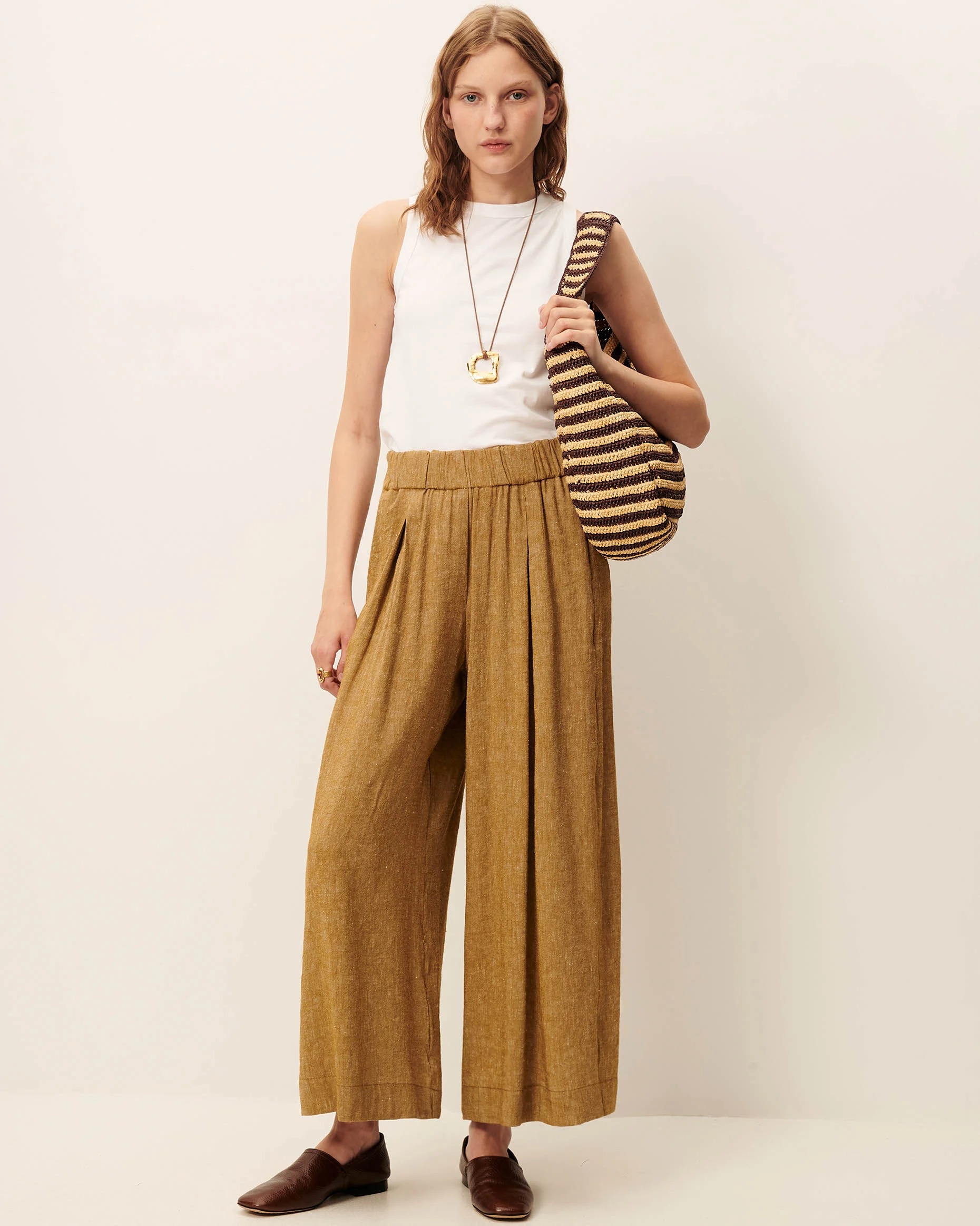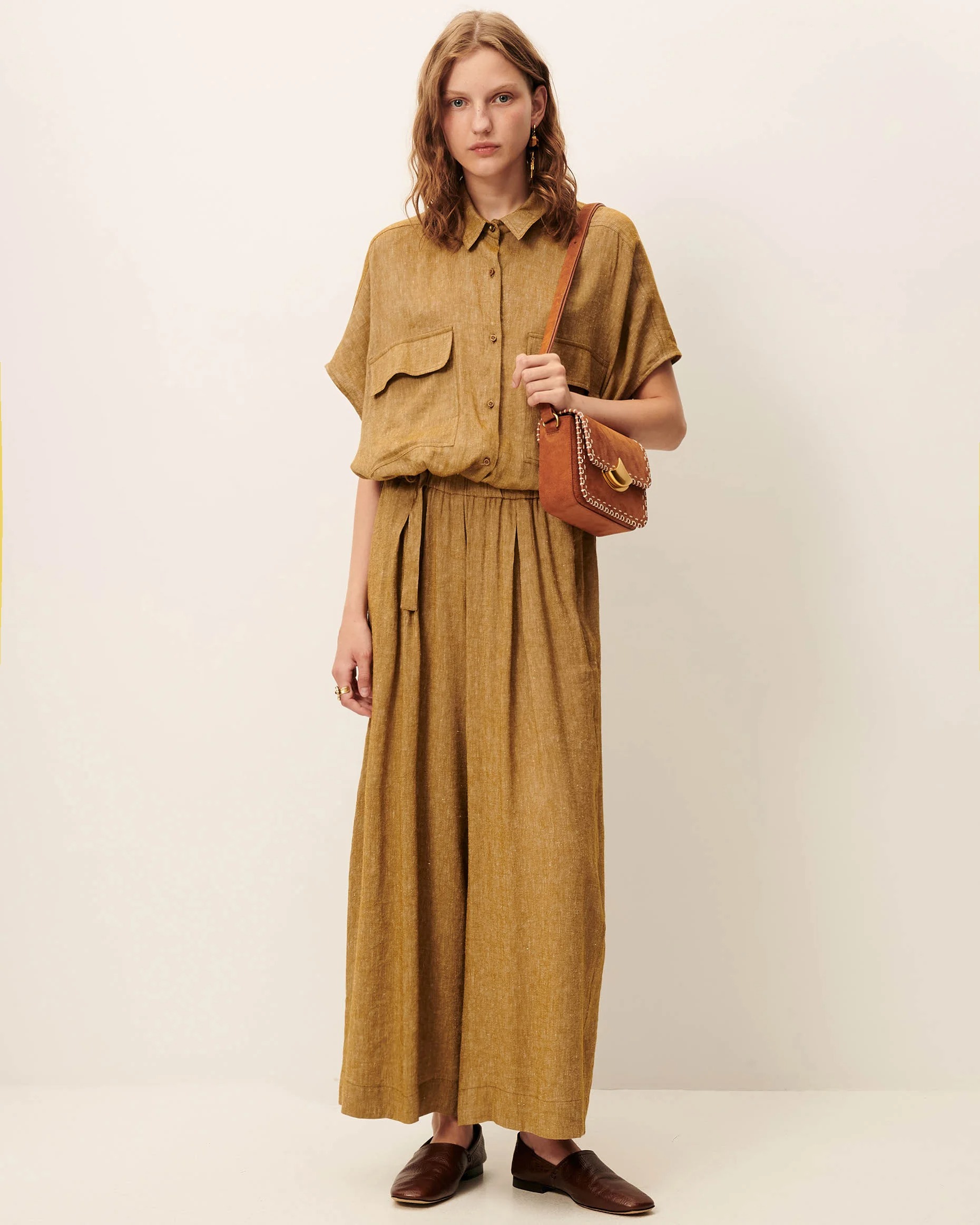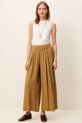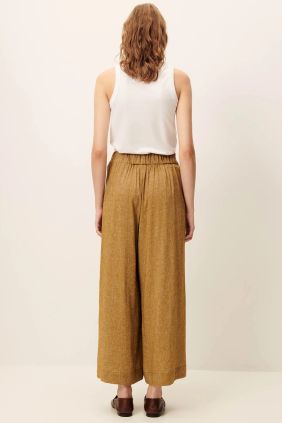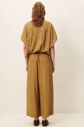 Pantalón femenino de estilo relajado y contemporáneo confeccionado en una mezcla de lino y viscosa que aporta ligereza, fluidez y frescura. Su diseño minimalista y natural refleja la esencia de la marca, ideal para crear looks cómodos y sofisticados.