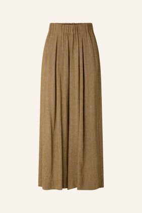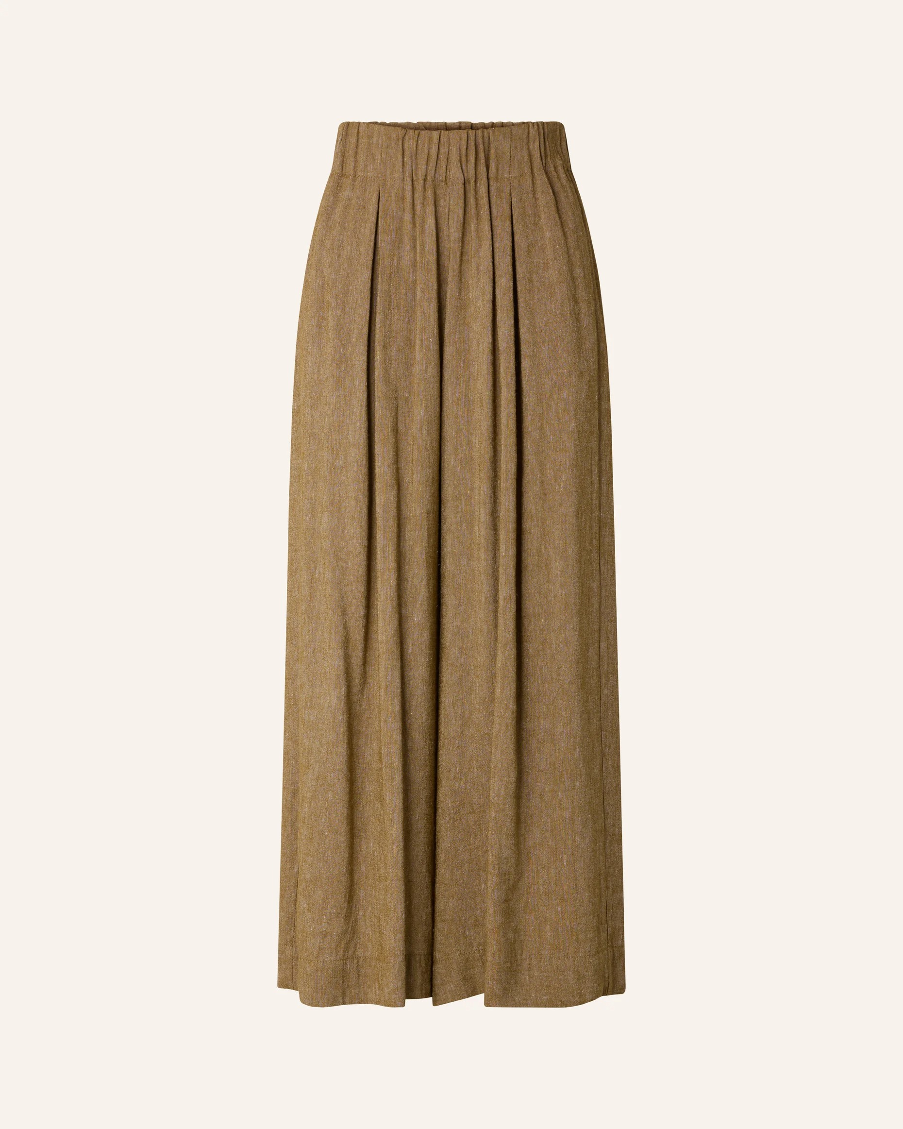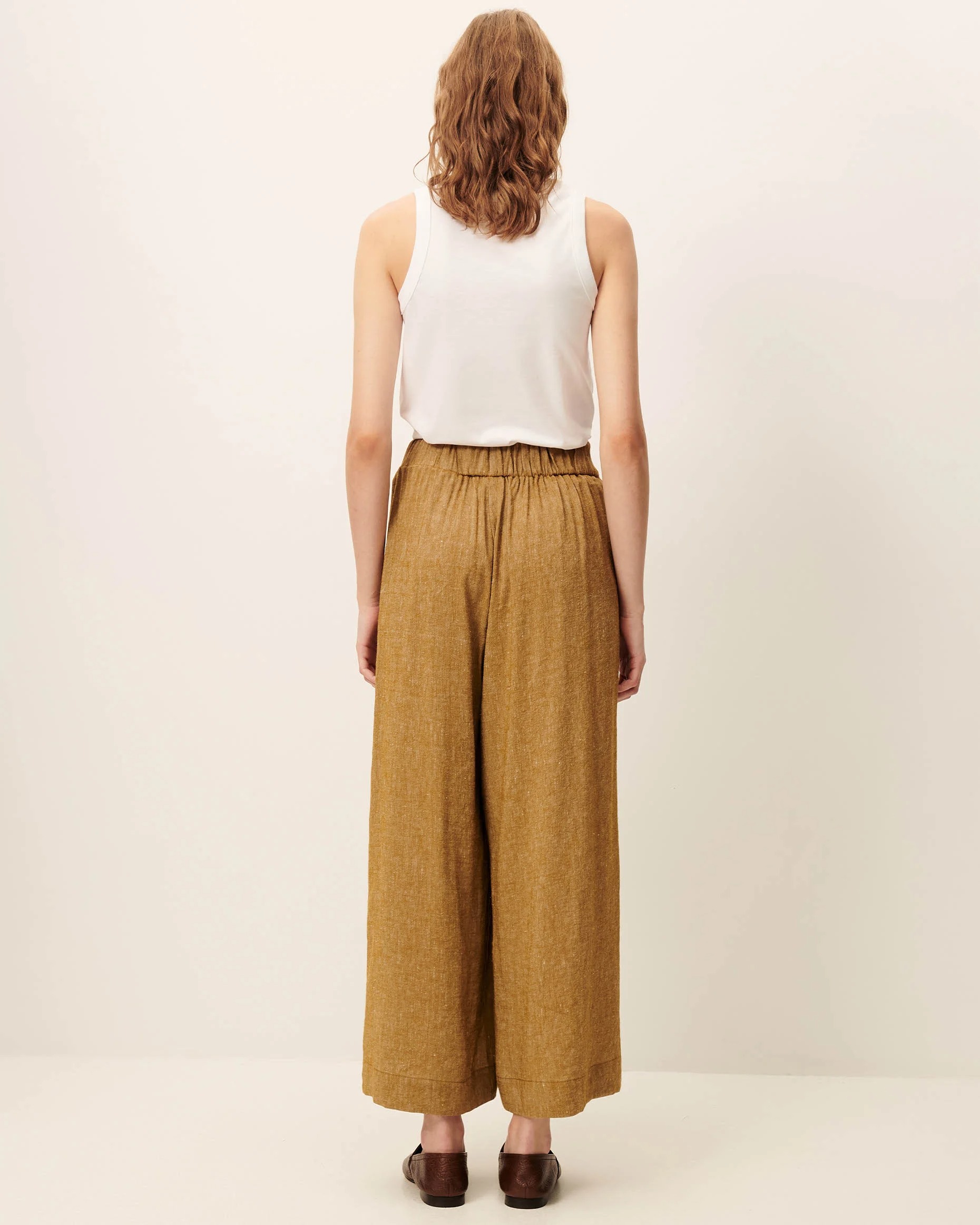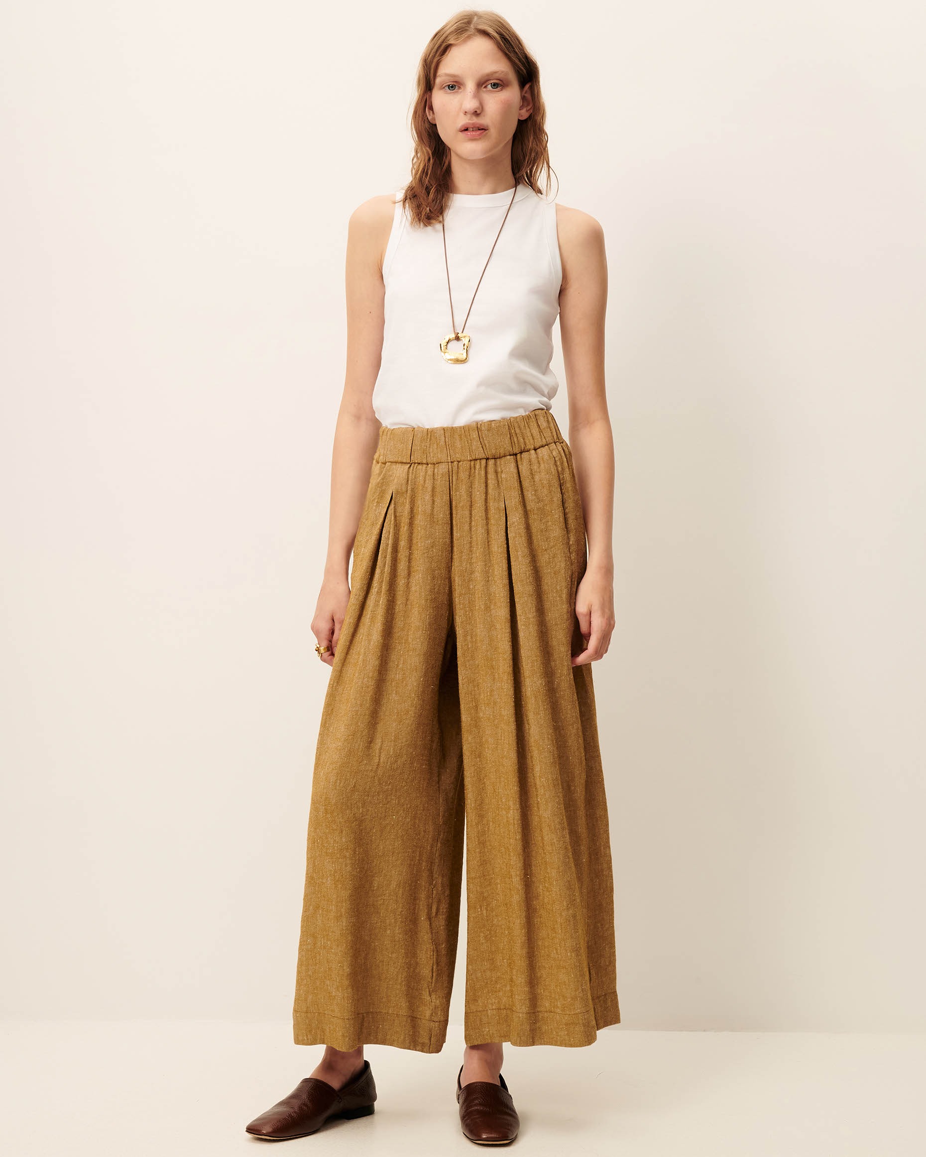 Pantalón femenino de estilo relajado y contemporáneo confeccionado en una mezcla de lino y viscosa que aporta ligereza, fluidez y frescura. Su diseño minimalista y natural refleja la esencia de la marca, ideal para crear looks cómodos y sofisticados.