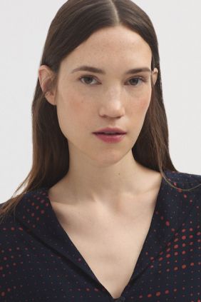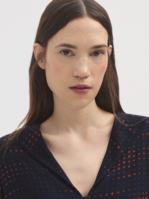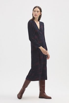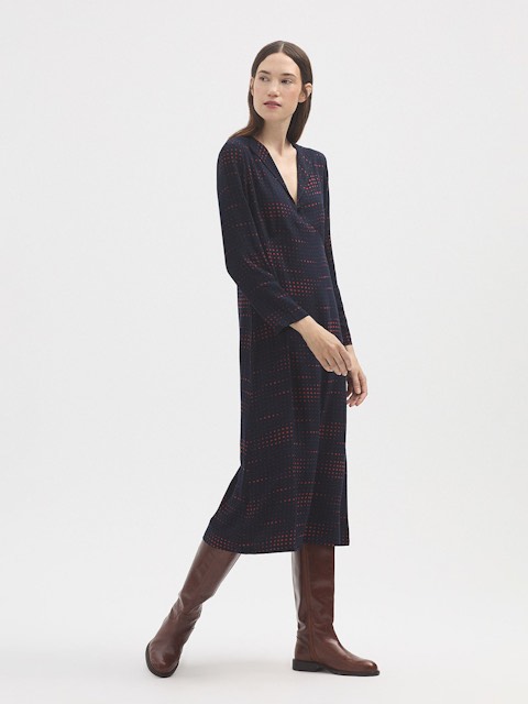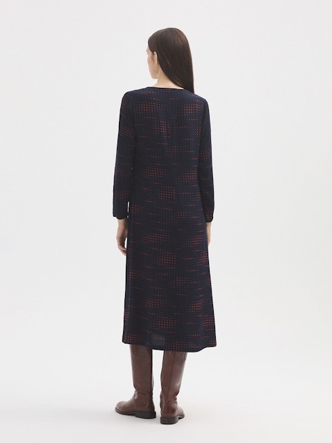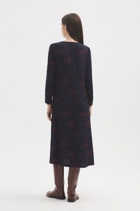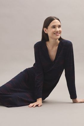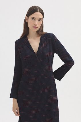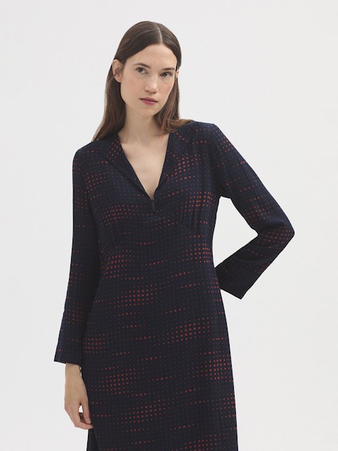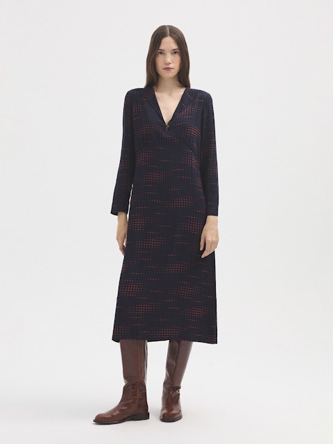 Vestido largo con estampado Scale Dots. Escote pico con pequeña solapa y botón. Costuras bajo el pecho para dar forma. Cremallera invisible lateral.