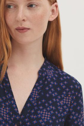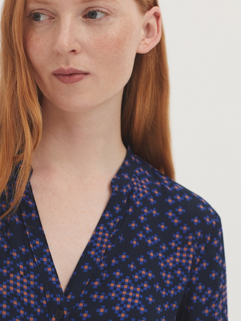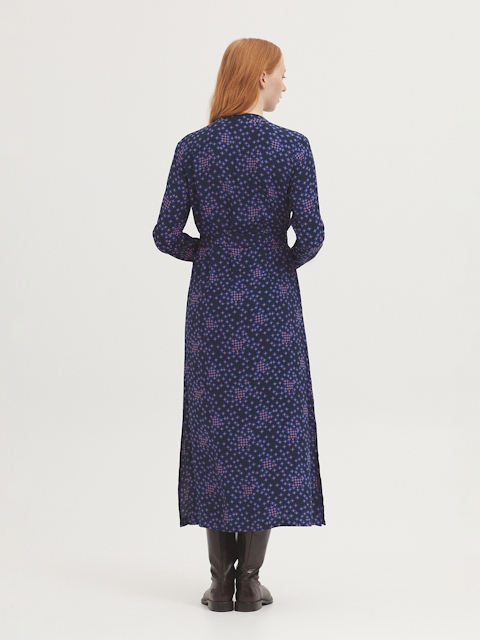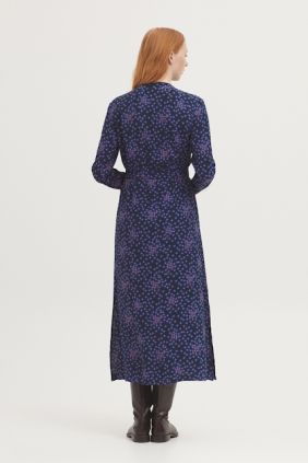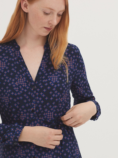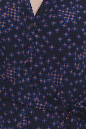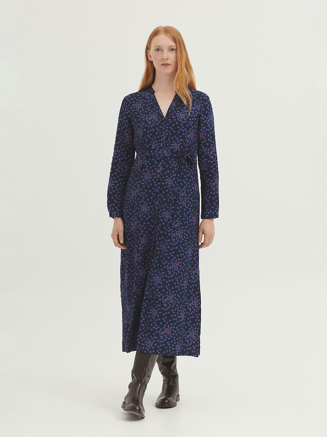 Vestido largo en crepé de viscosa con estampado Pixel. Cuello mao abierto y botonadura frontal. Bolsillos. Manga larga con abertura, puño y botón. Aberturas laterales en el bajo. Cinturón del mismo tejido.