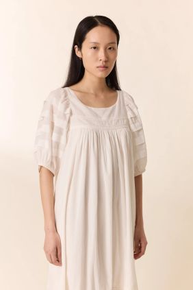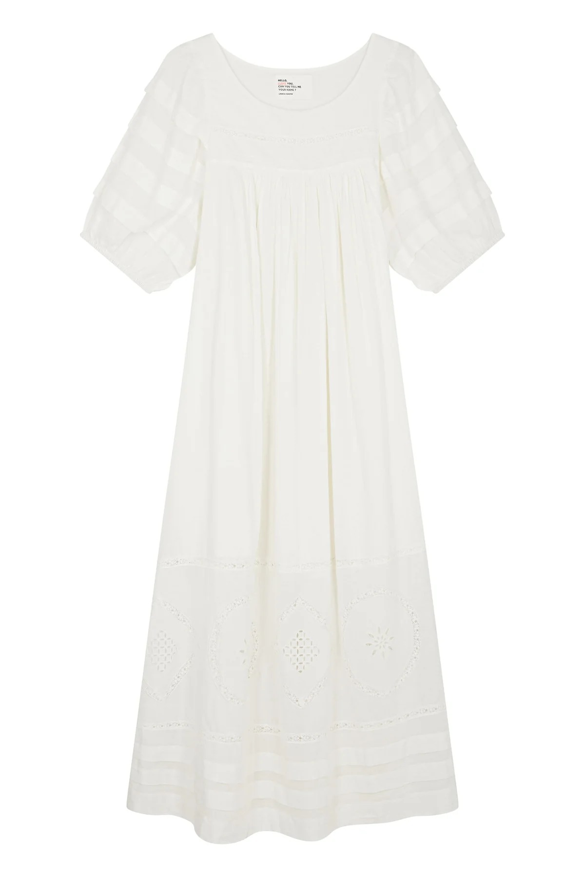 Vestido largo femenino Rosaly Lace de Leon & Harper en color blanco, confeccionado en 100?% algodón orgánico con detalles de encaje decorativo que aportan un toque delicado y elegante. Esta prenda combina feminidad y estilo contemporáneo, con una silueta fluida y holgada que permite libertad de movimiento y máximo confort.