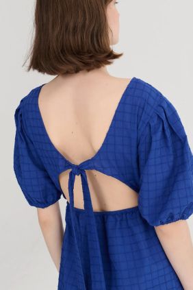 Este vestido presenta un diseño con espalda descubierta (back cut) que aporta un toque moderno y distintivo a la silueta, combinado con cortes y líneas fluidas que favorecen el movimiento. Su corte relajado lo convierte en una prenda versátil y fácil de llevar en cualquier ocasión, desde salidas urbanas hasta planes más especiales.