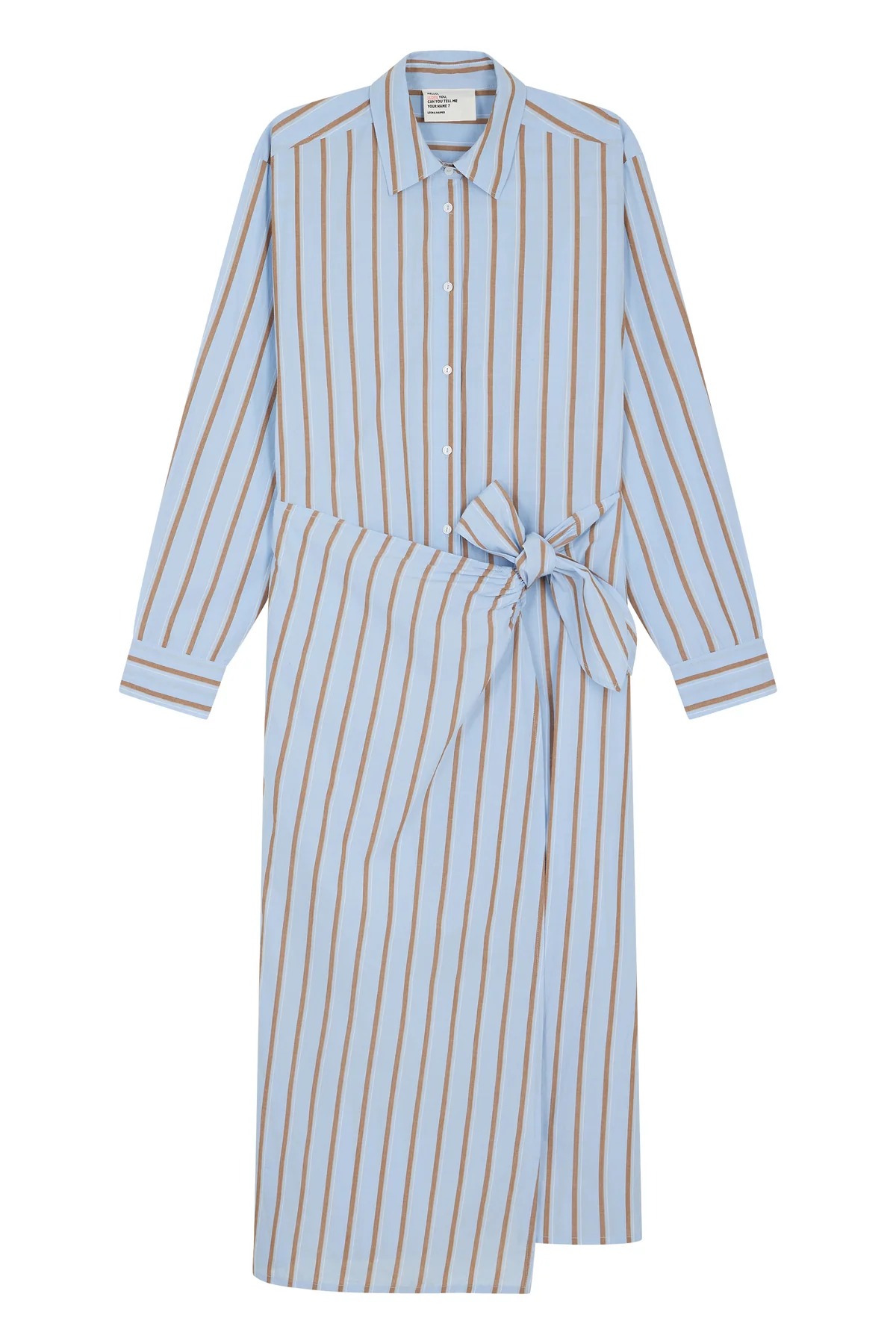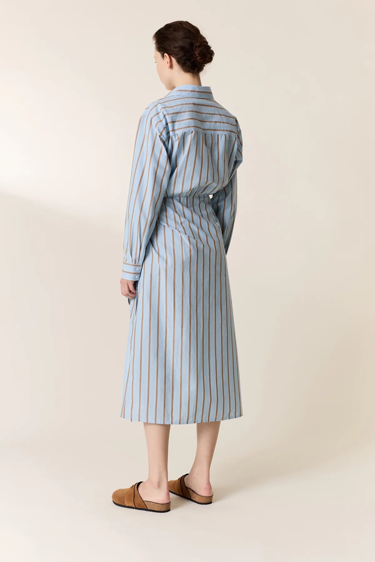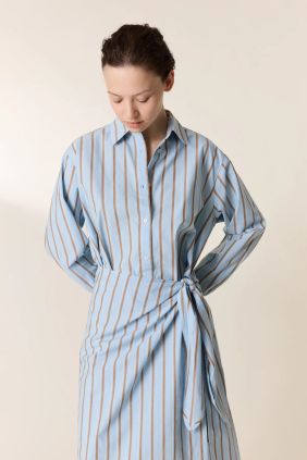 Vestido femenino de estilo relajado y elegante en tonos azul cielo con rayas, diseñado para aportar frescura y un aire sofisticado a tu armario. Este vestido refleja el estilo parisino característico de Leon & Harper, combinando comodidad con un diseño femenino y atemporal.