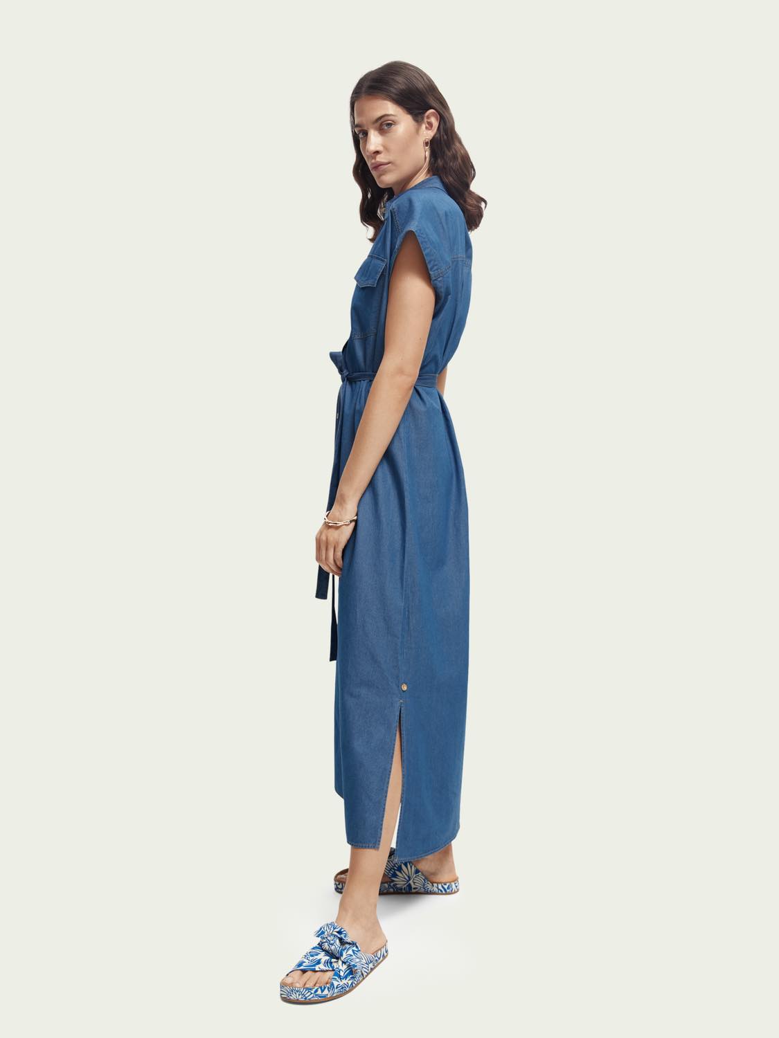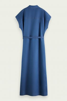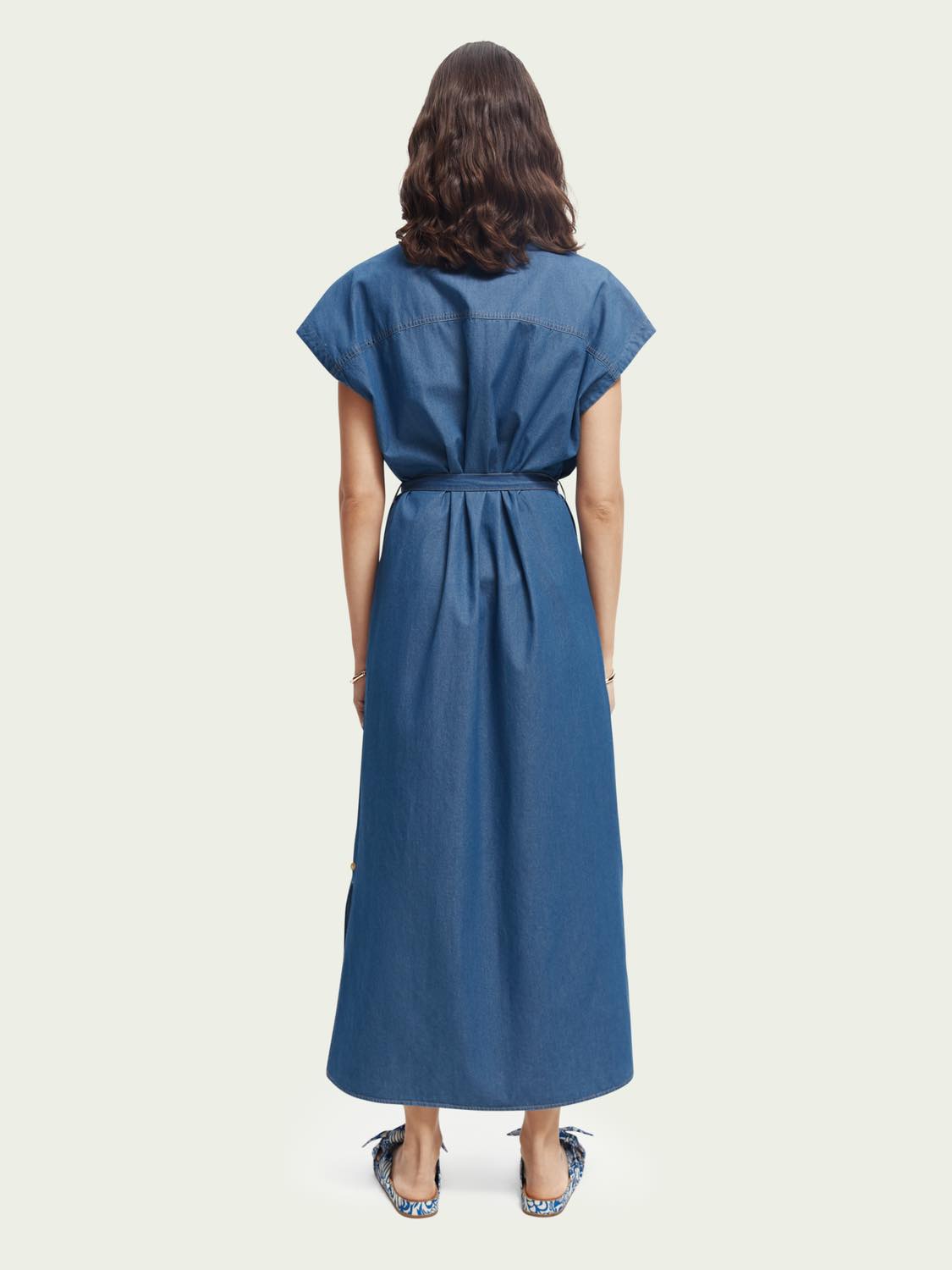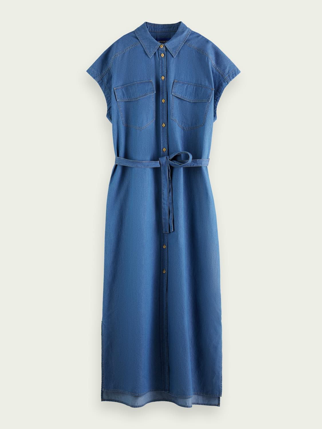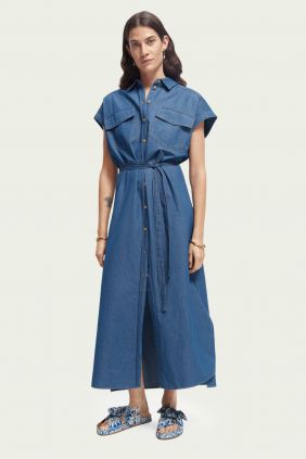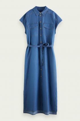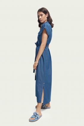 Este vestido vaquero sin mangas es ligero y tiene un cierre de botones y un cinturón de lazo. Ideal para el verano.