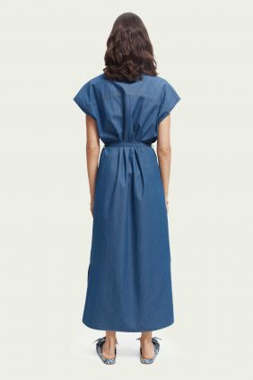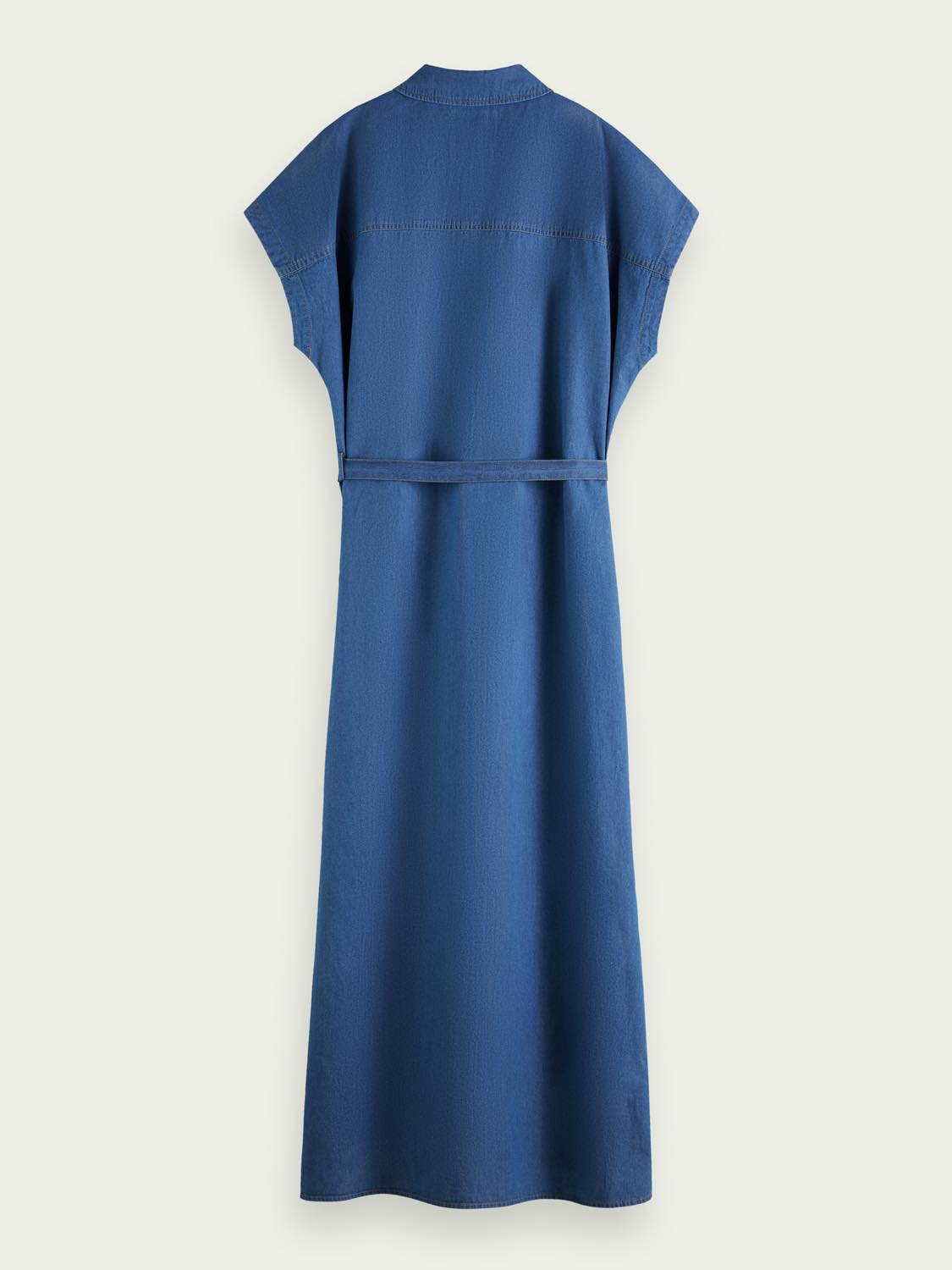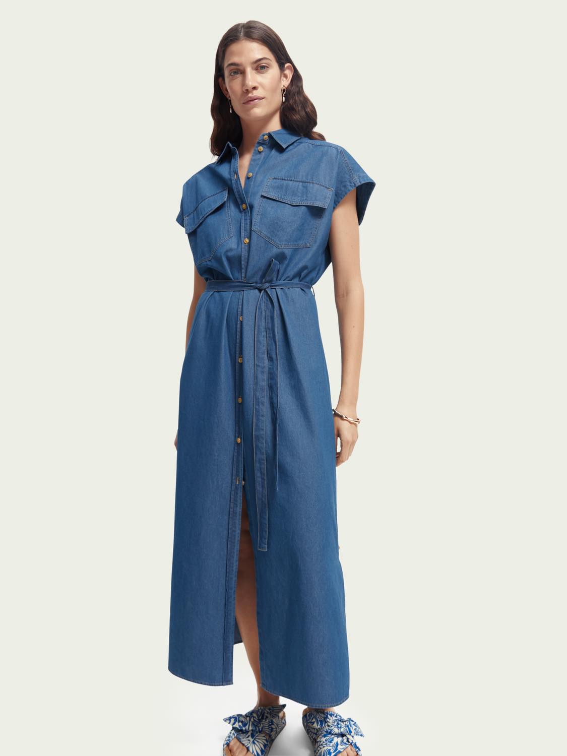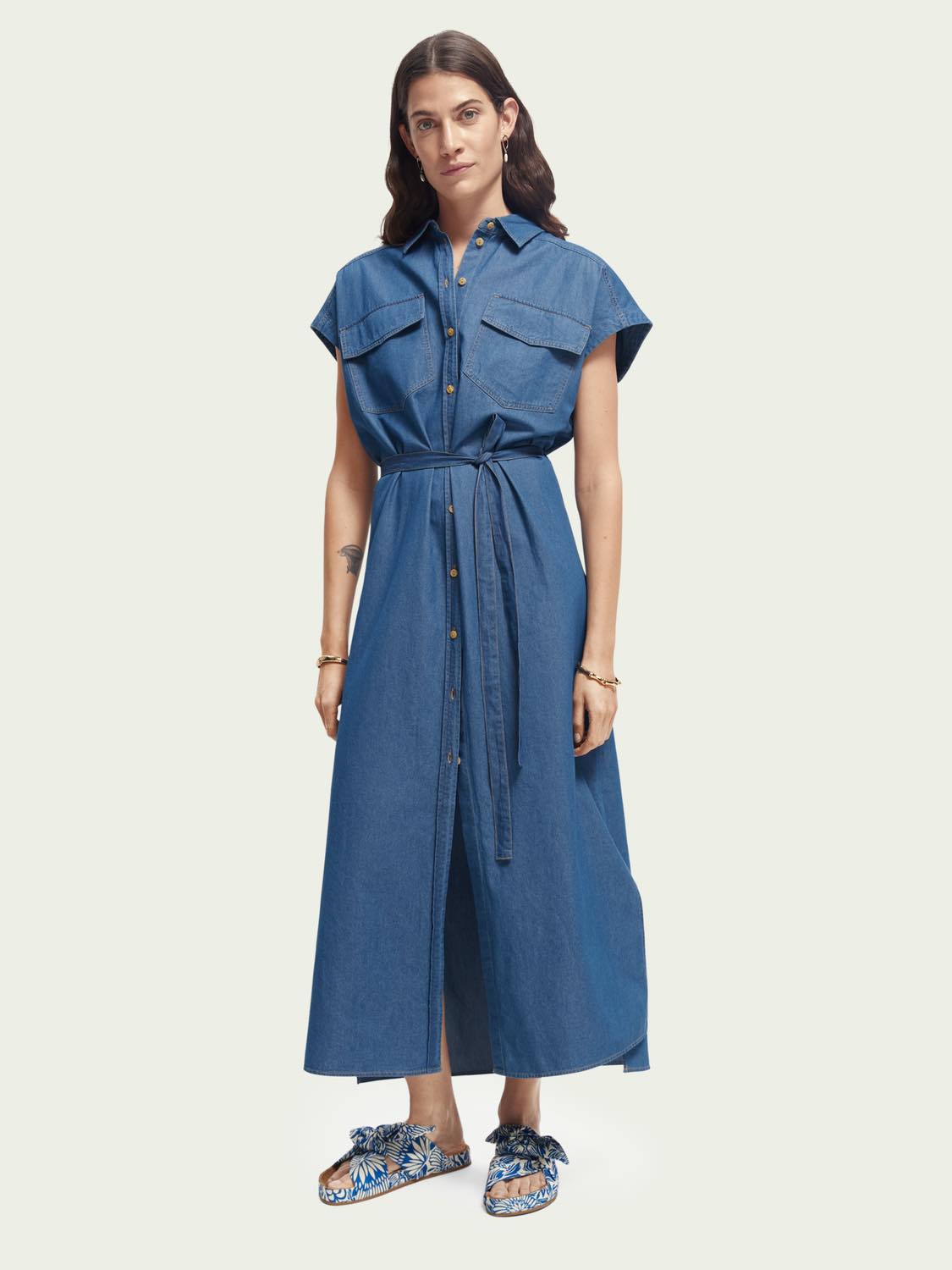 Este vestido vaquero sin mangas es ligero y tiene un cierre de botones y un cinturón de lazo. Ideal para el verano.