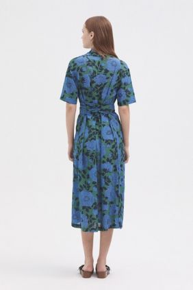 Vestido tejido cuadrillé estampado Camelia de viscosa y algodón sostenible. Escote pico, corte en cintura y manga corta. Tiras del mismo tejido para cerrar y ajustar el modelo.